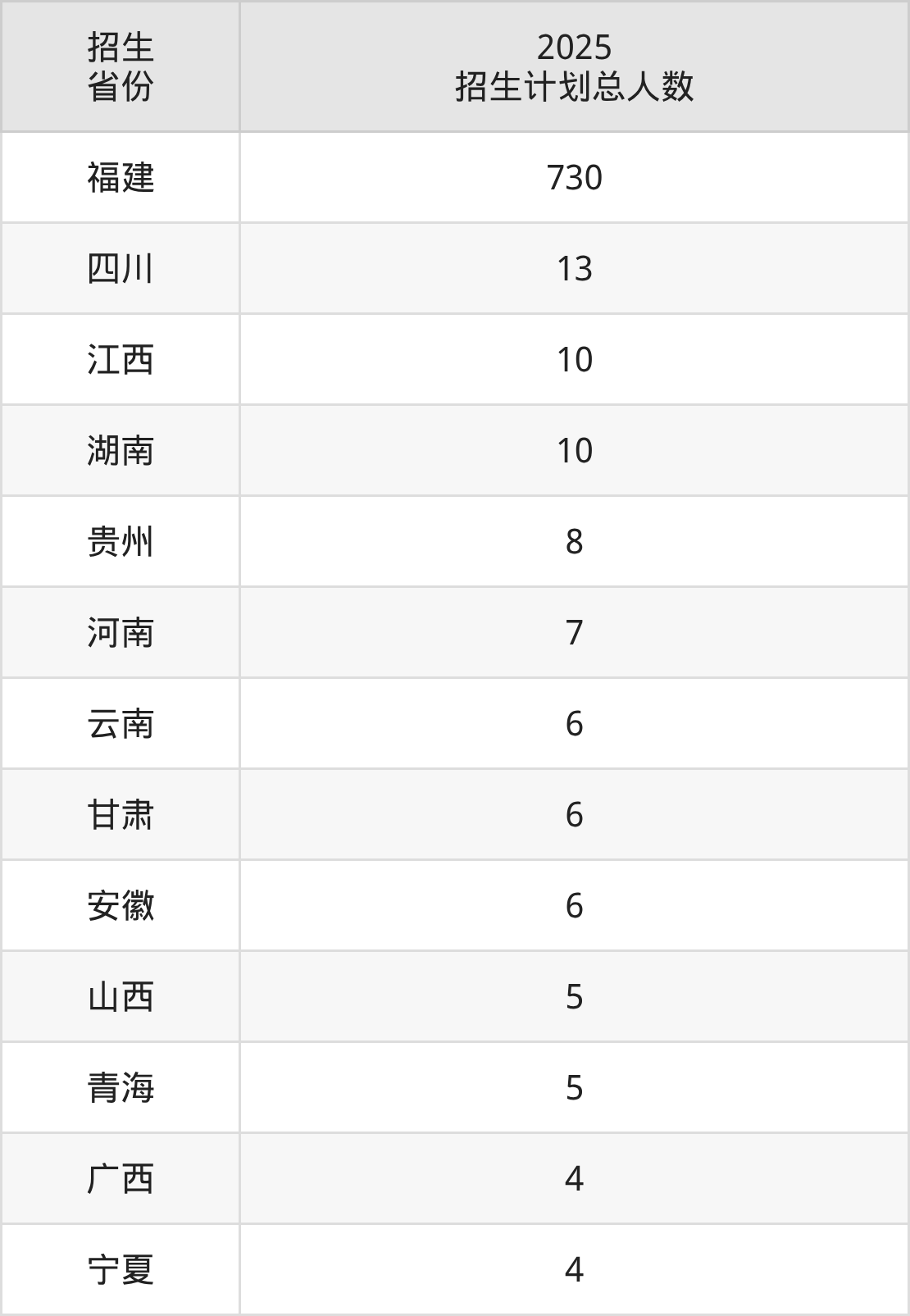2025年福建农业职业技术学院面向全国13个省市开展专科招生;招生专业共29个,招生人数共814人。2025年在福建省招生计划总人数是730人,其中,福建农业职业技术学院在福建省招生人数最多的是大数据与会计。福建农业职业技术学院在各省具体招生人数情况如下表。