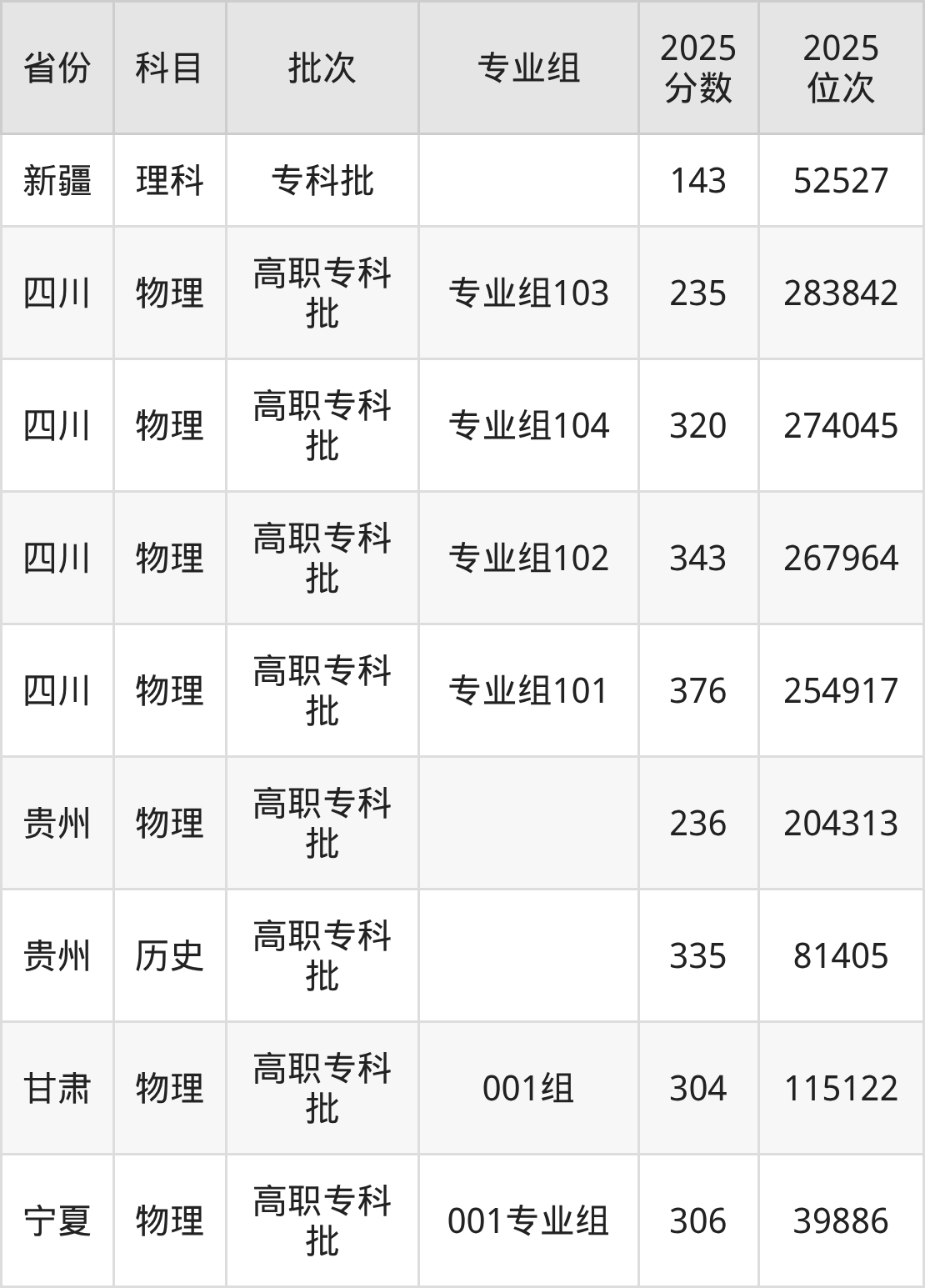 2025年在专科物理类进行招生,各专业组分数线详情如下: