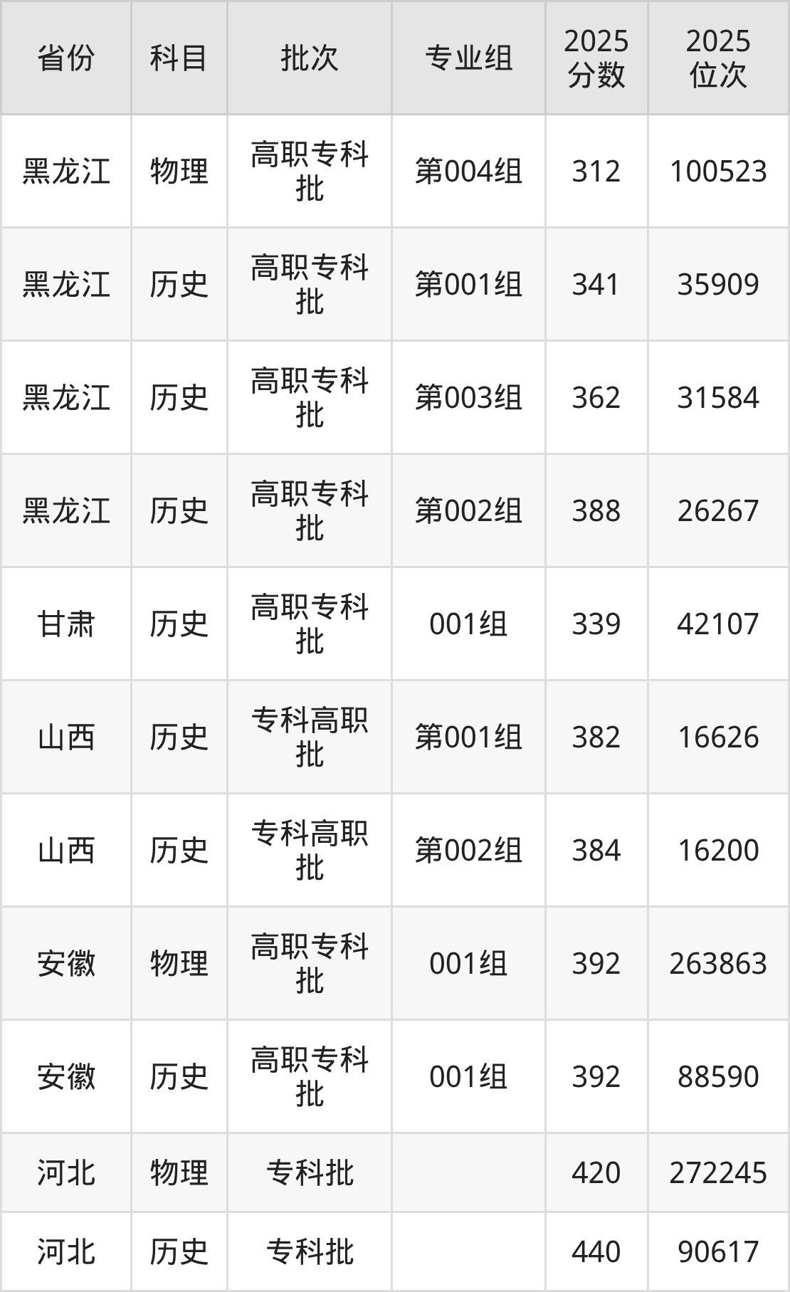 2025年在专科历史类进行招生,各专业组分数线详情如下: