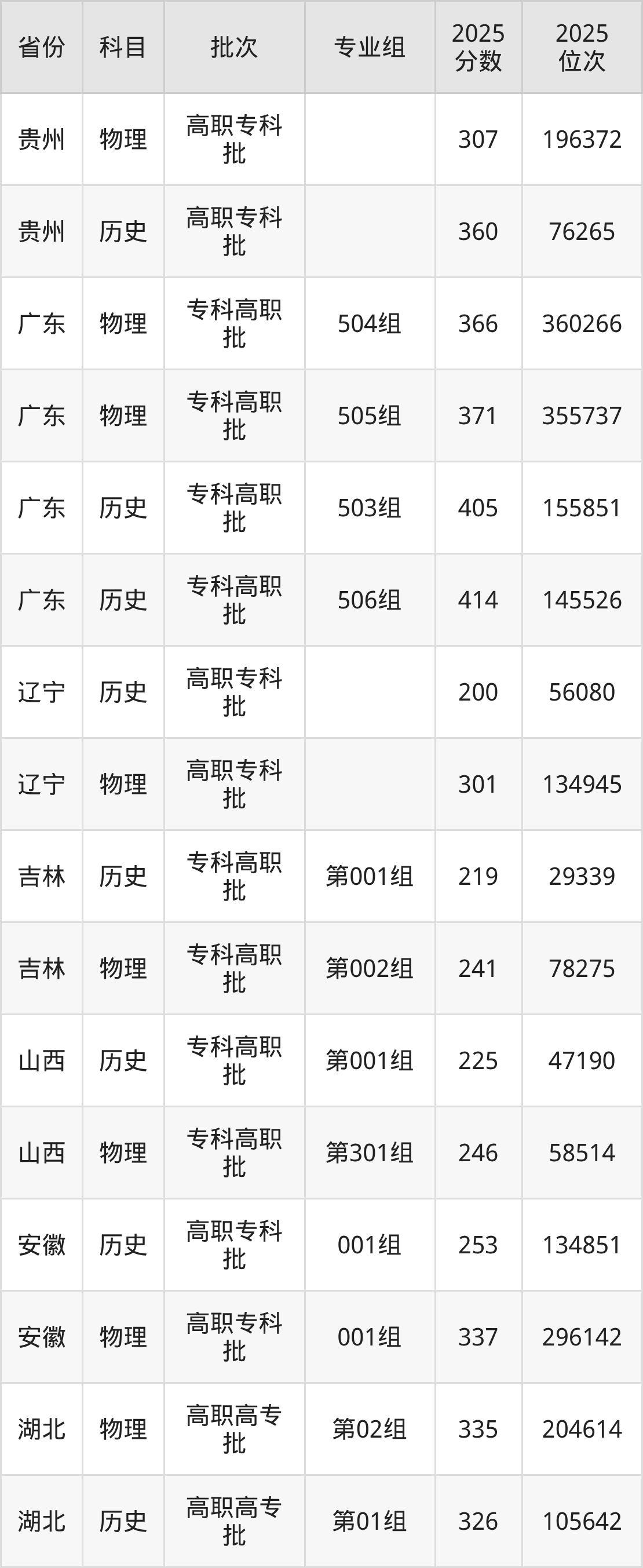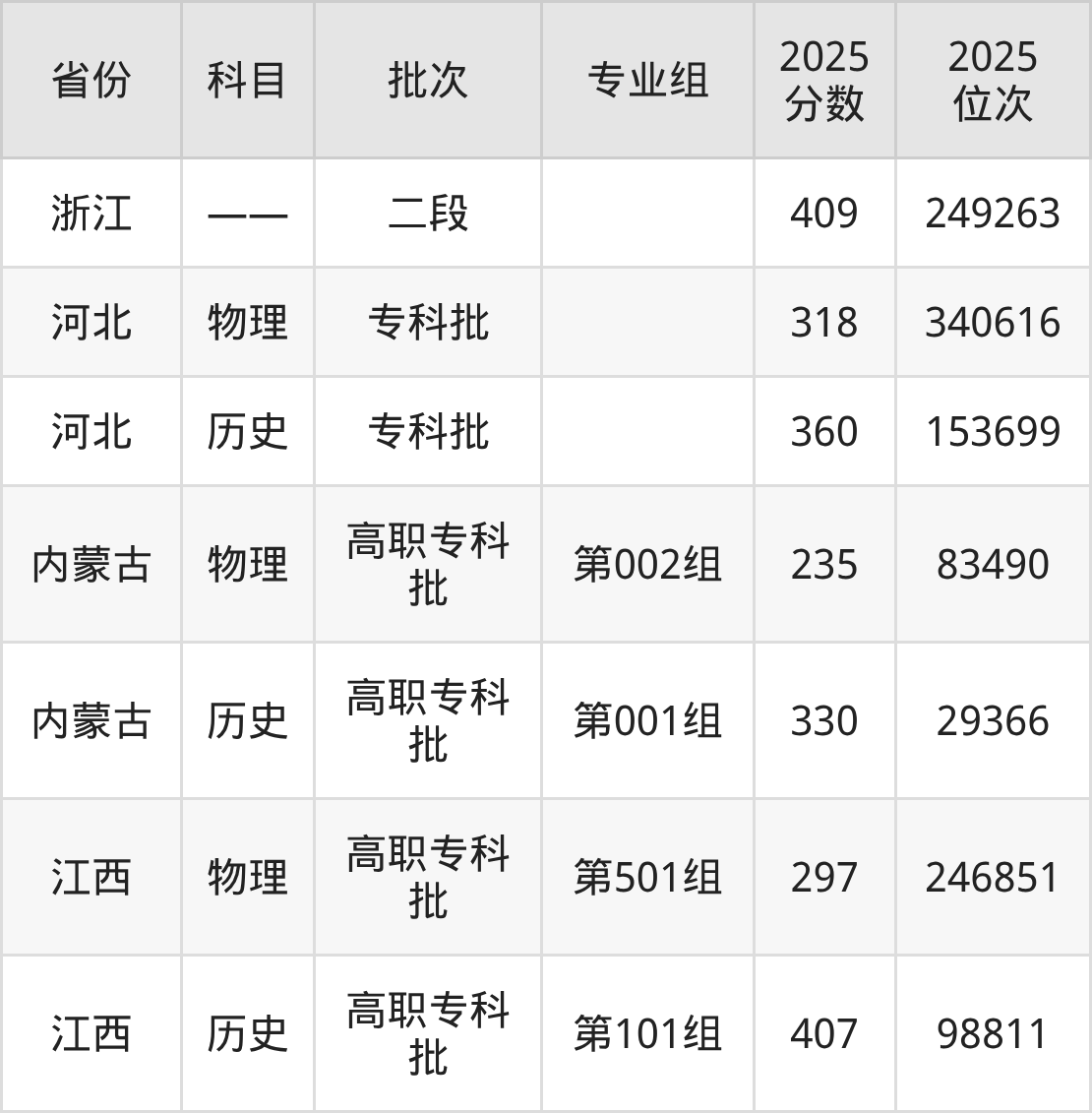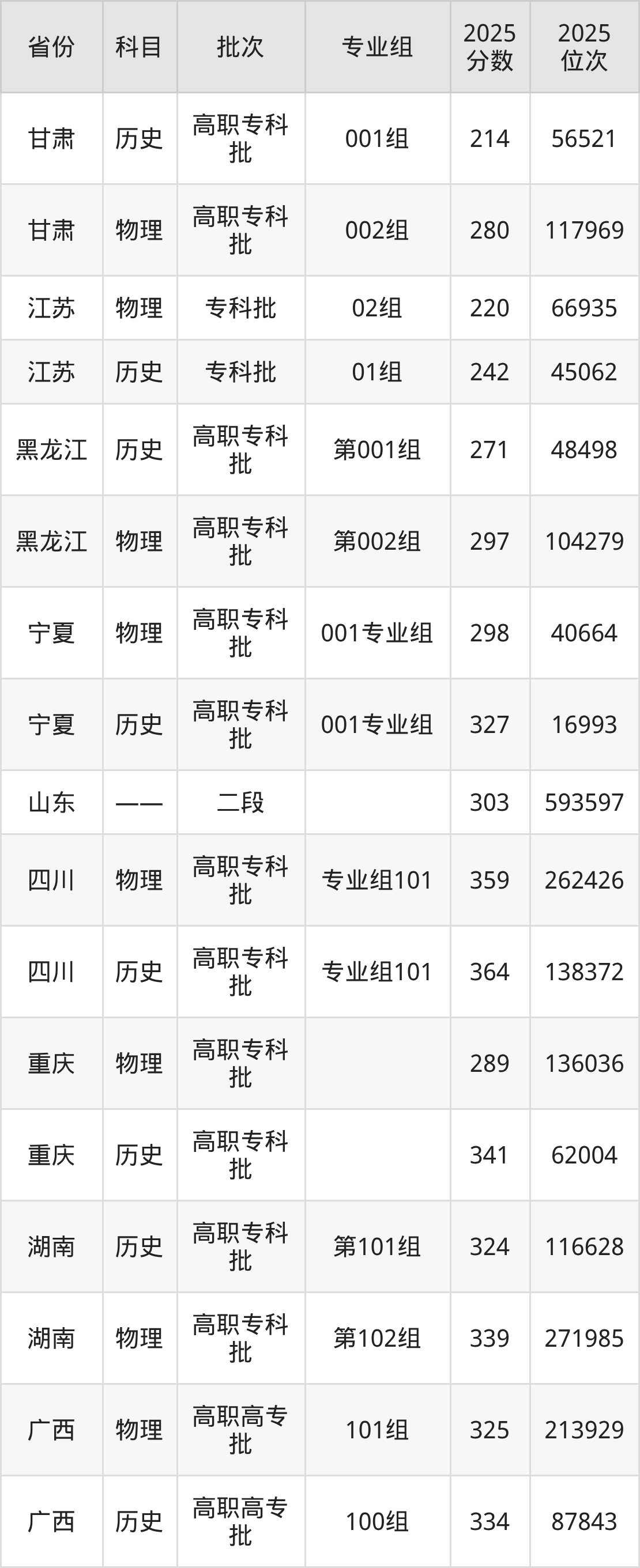 普通类专科物理类最低298分,专科历史类最低327分