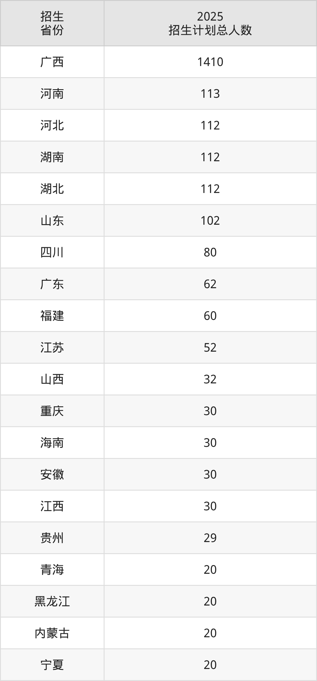 2025年广西自然资源职业技术学院面向全国26个省市开展专科招生;招生专业共19个,招生人数共2558人。2025年在广西壮族自治区招生计划总人数是1410人,其中,广西自然资源职业技术学院在广西壮族自治区招生人数最多的是大数据与会计。广西自然资源职业技术学院在各省具体招生人数情况如下表。