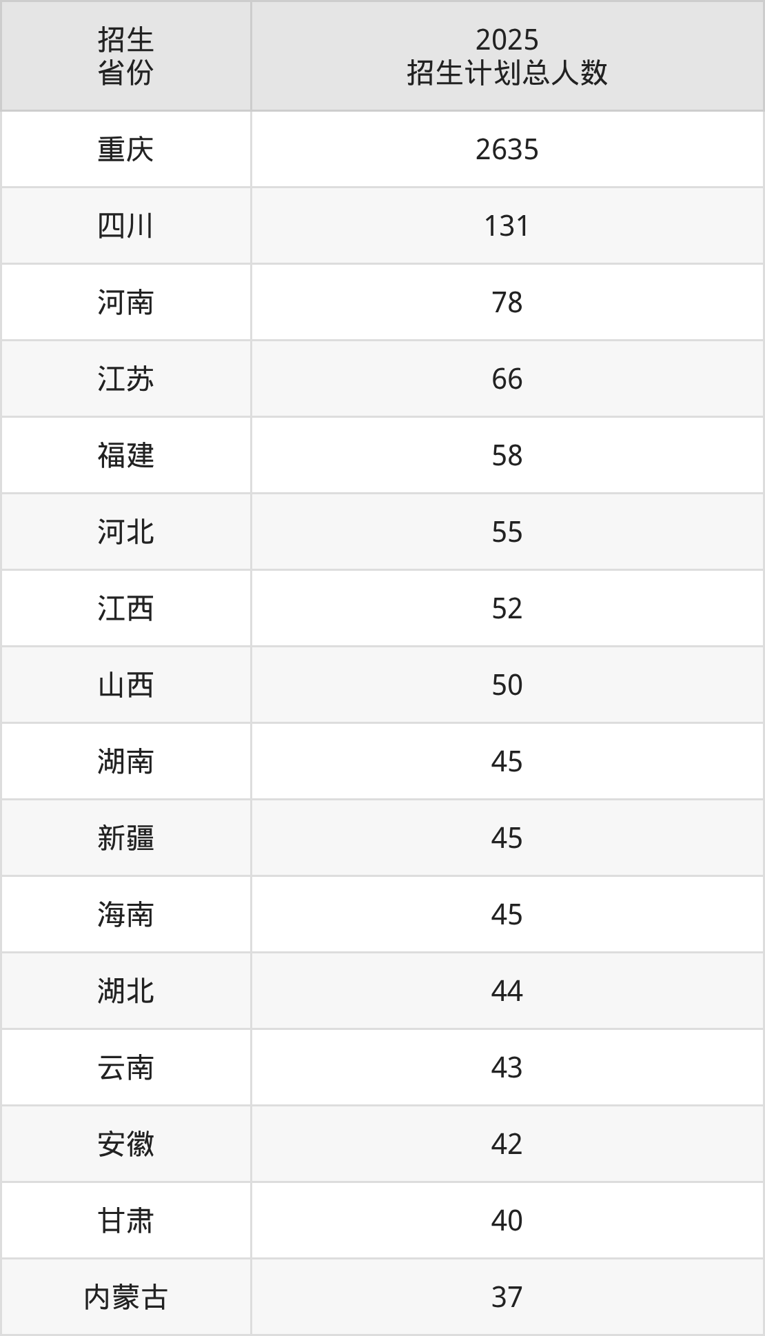 2025年重庆三峡学院面向全国24个省市开展本科招生;招生专业共46个,招生人数共3668人。2025年在重庆市招生计划总人数是2635人,其中,重庆三峡学院在重庆市招生人数最多的是化学工程与工艺。重庆三峡学院在各省具体招生人数情况如下表。