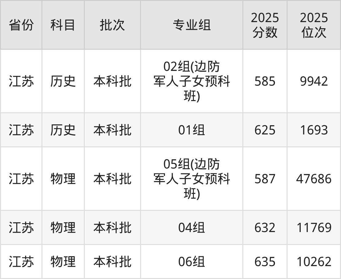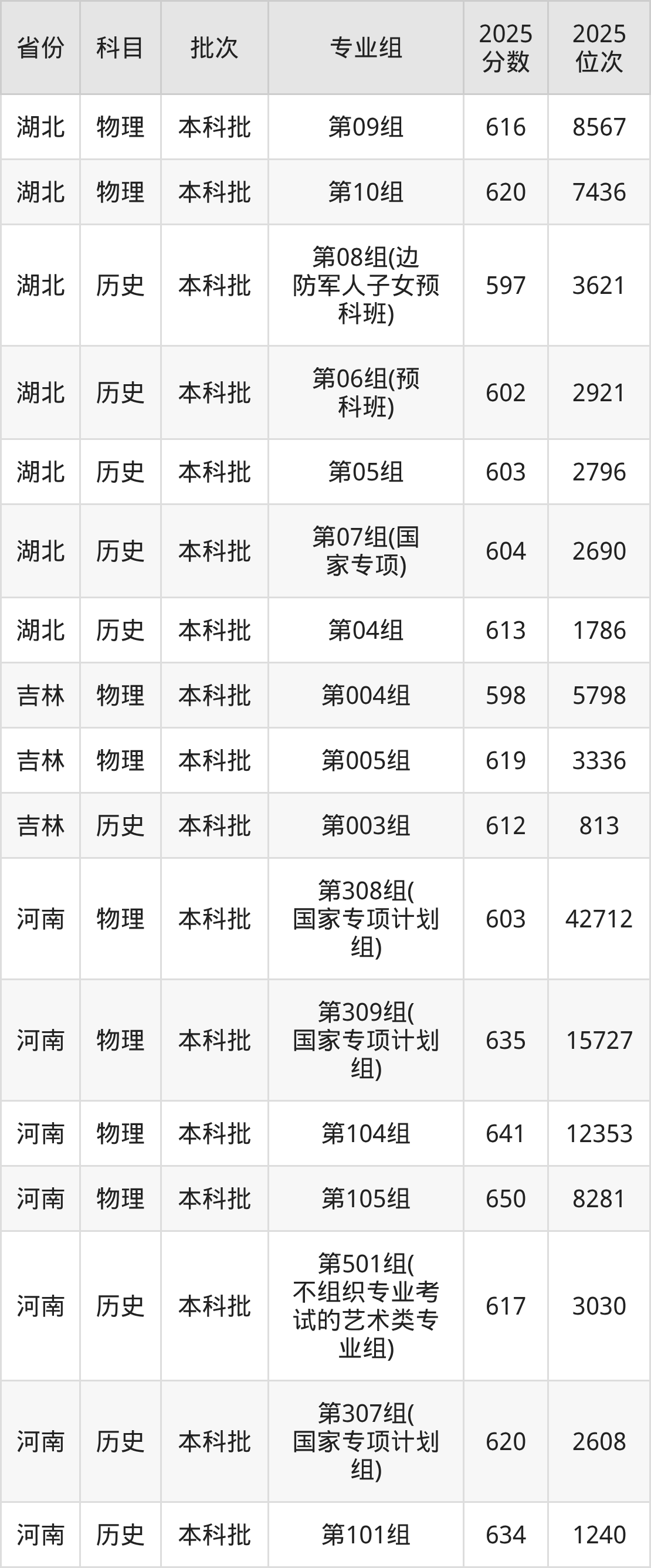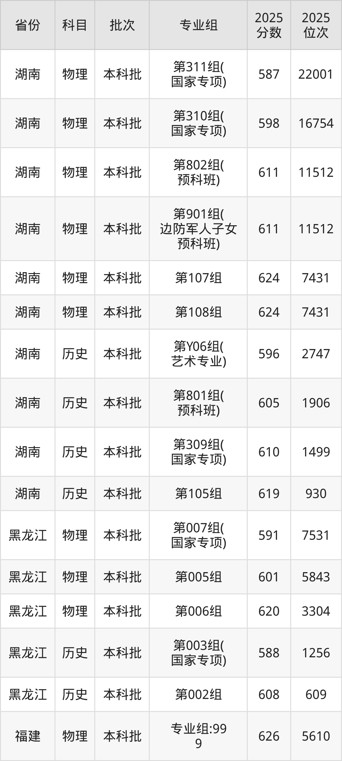 湖南大学05组(边防军人子女预科班):2025年投档录取最低分为587分,录取最低位次为47686名。