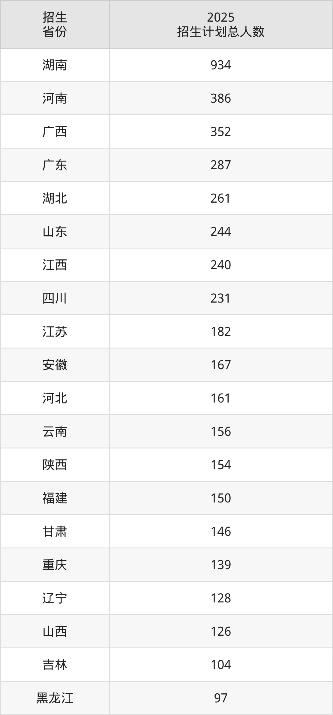 2025年湖南大学面向全国29个省市开展本科招生;招生专业共50个,招生人数共5299人。2025年在湖南省招生计划总人数是934人,其中,湖南大学在湖南省招生人数最多的是电气工程及其自动化。湖南大学在各省具体招生人数情况如下表。