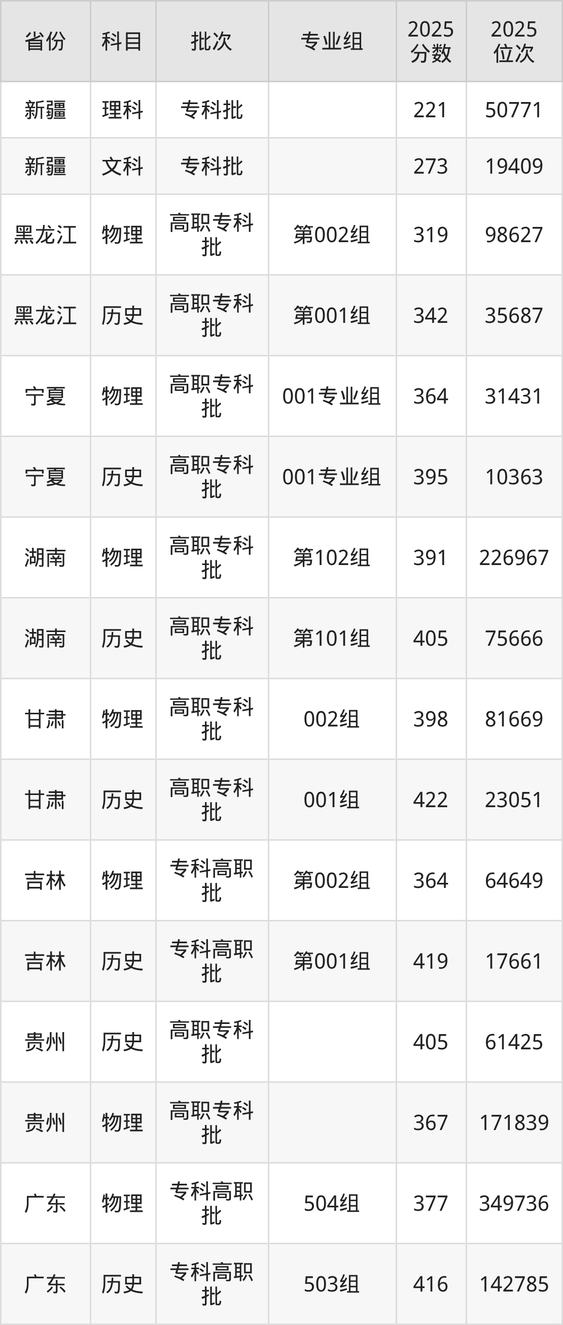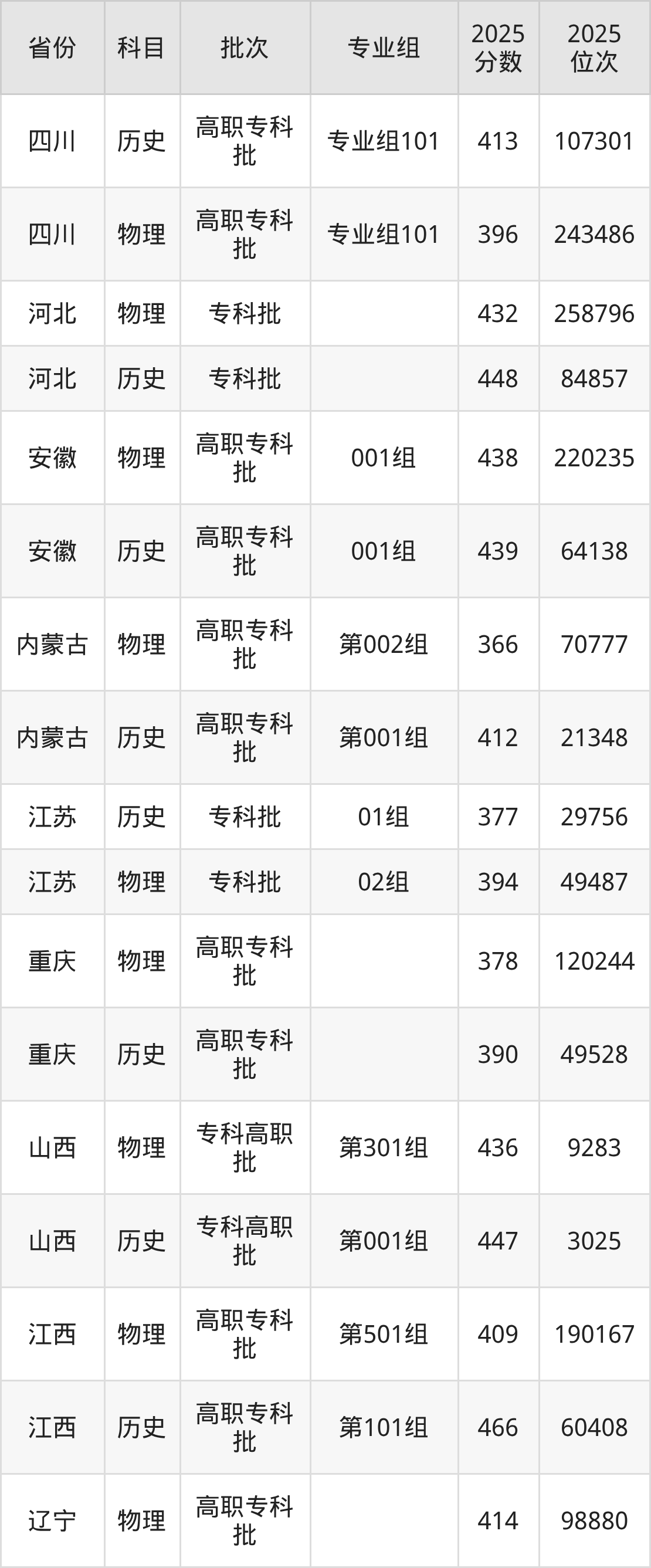 普通类专科物理类最低409分,专科历史类最低466分