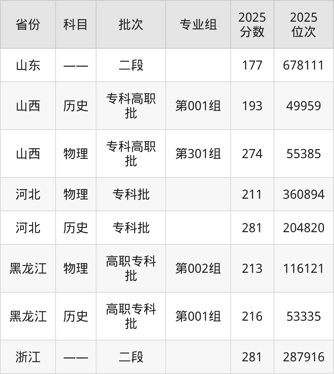 普通类专科历史类最低281分,专科物理类最低211分