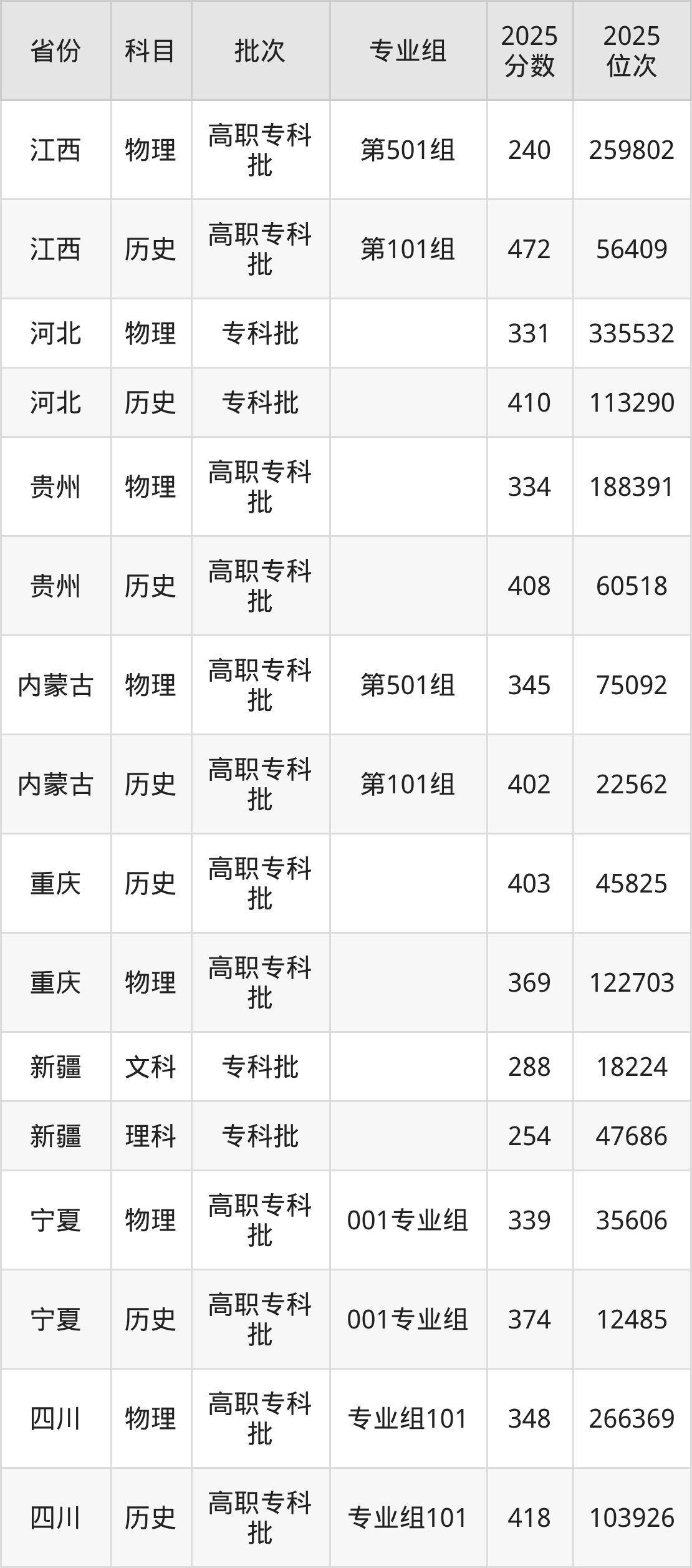 2025年宝鸡职业技术学院全国录取分数线是240分到486分,录取最低在江西物理类(第501组)、录取最高在河北历史类。各省各专业组最低分具有差异,详情如下: