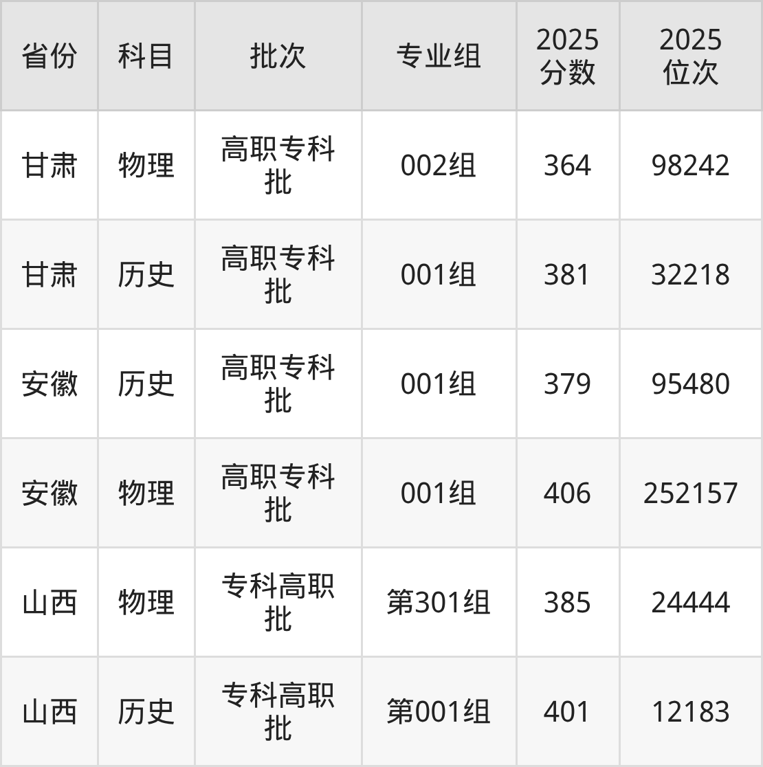 普通类专科物理类最低345分,专科历史类最低402分