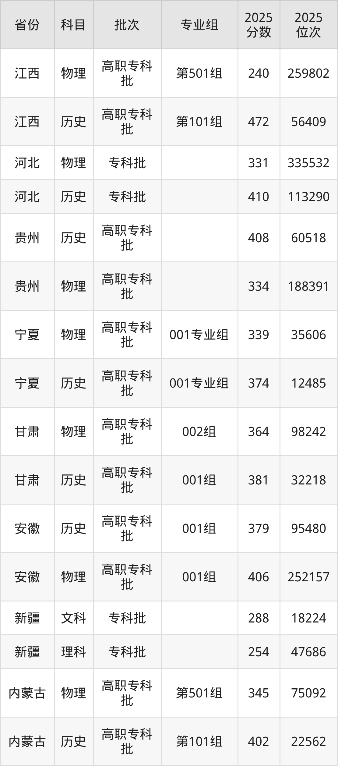 普通类专科物理类最低331分,专科历史类最低410分