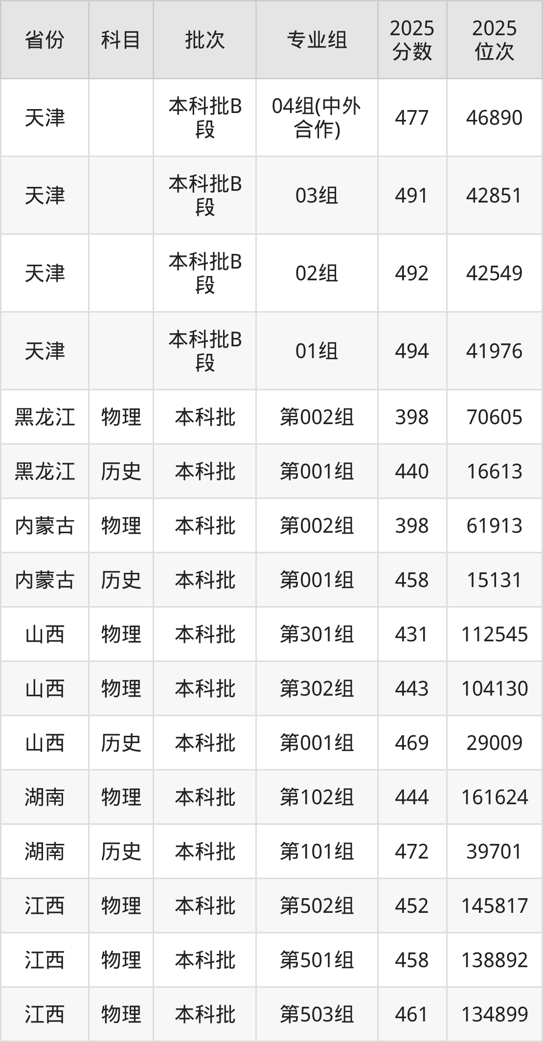 下面是2025年天津财经大学珠江学院全国录取分数线一览表,请查阅。