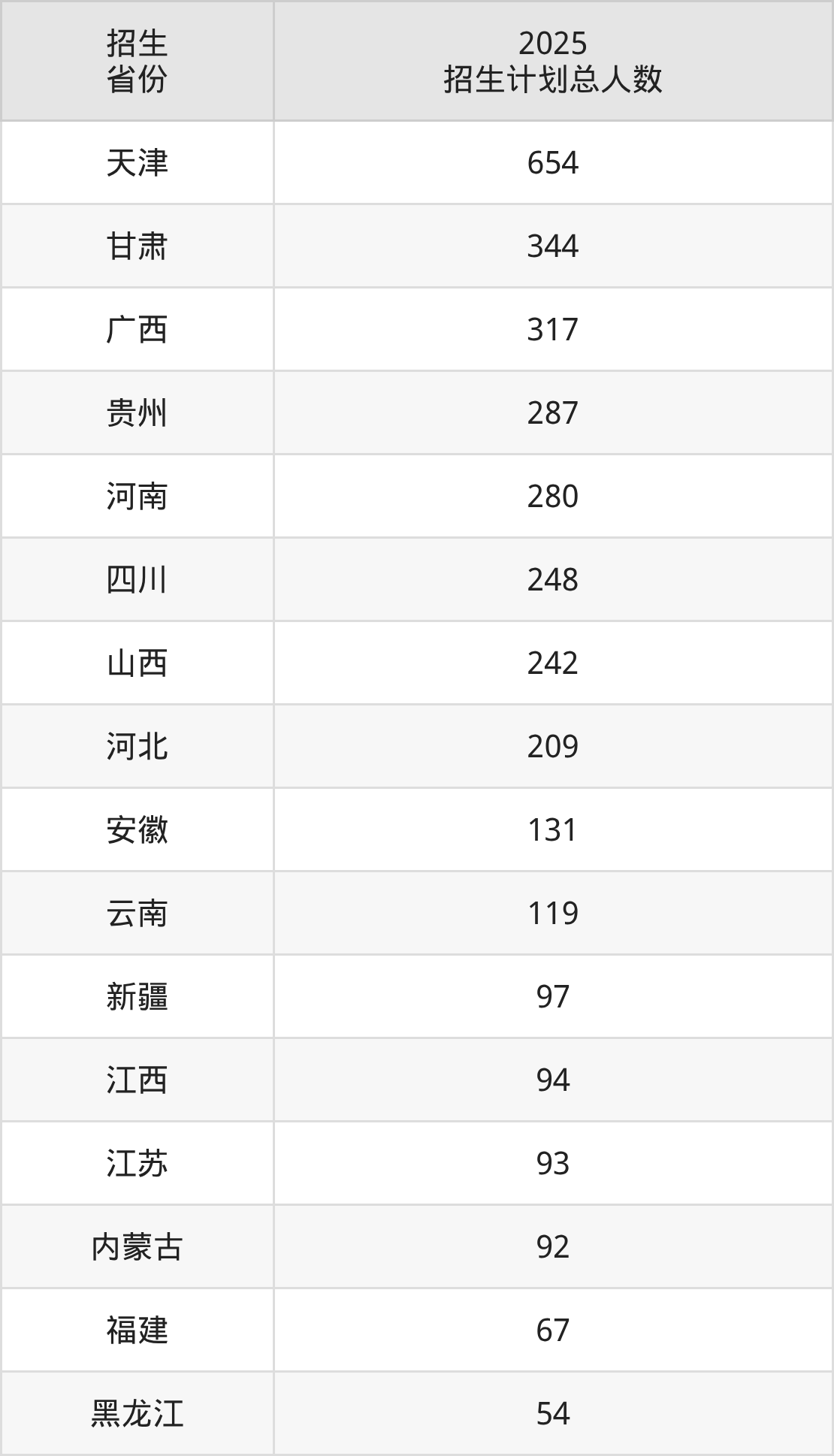 2025年天津财经大学珠江学院面向全国28个省市开展本科招生;招生专业共29个,招生人数共3699人。2025年在天津市招生计划总人数是654人,其中,天津财经大学珠江学院在天津市招生人数最多的是会计学。天津财经大学珠江学院在各省具体招生人数情况如下表。