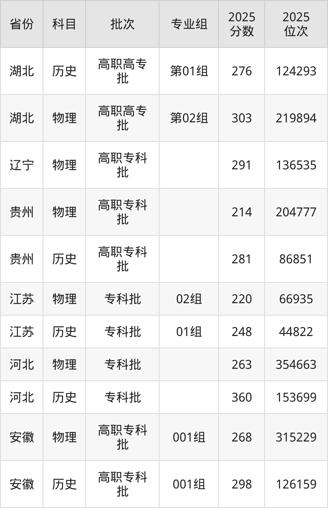 2025年合肥科技职业学院全国录取分数线是214分到360分,录取最低在贵州物理类、录取最高在河北历史类。各省各专业组最低分具有差异,详情如下:
