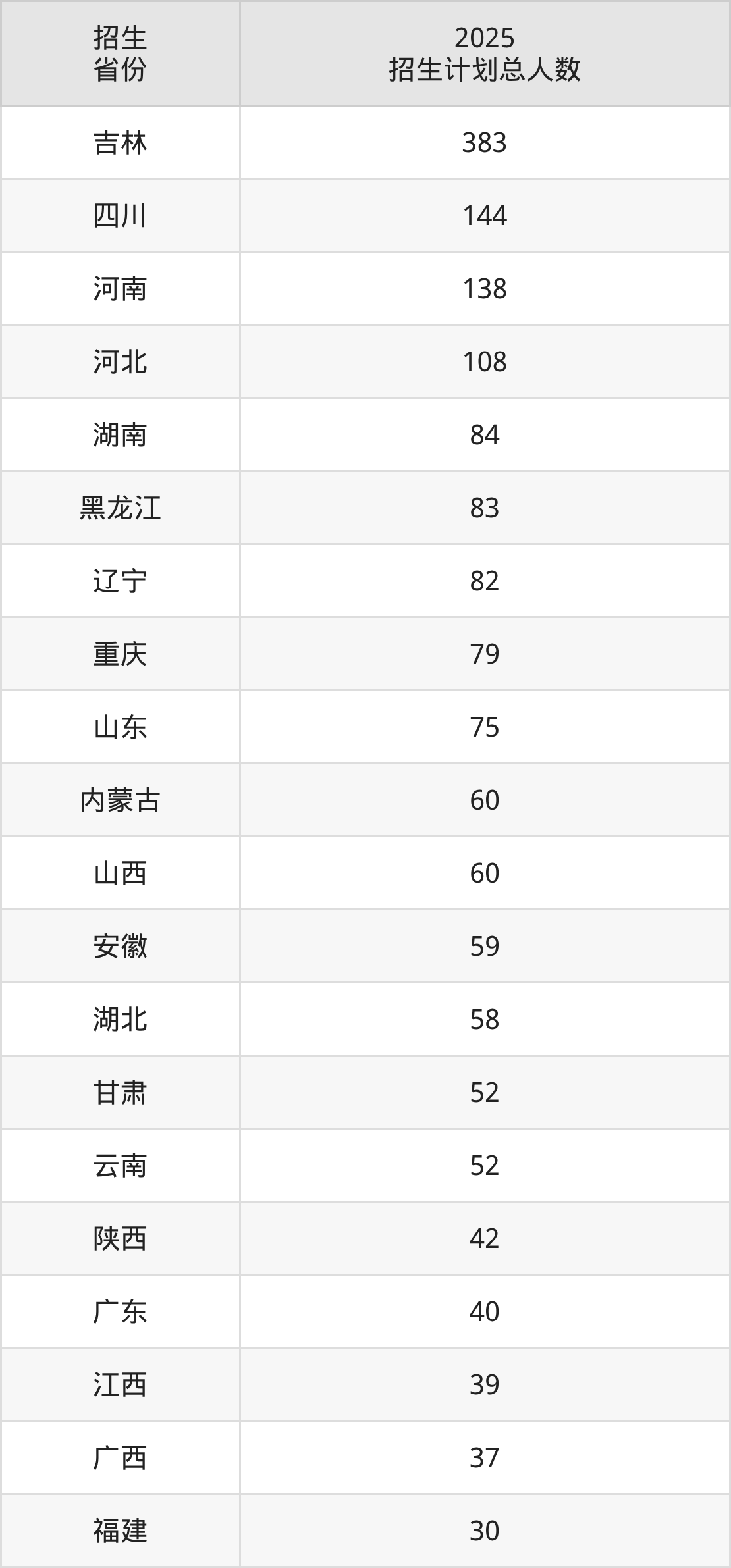2025年东北师范大学面向全国29个省市开展本科招生;招生专业共34个,招生人数共1869人。2025年在吉林省招生计划总人数是383人,其中,东北师范大学在吉林省招生人数最多的是数学类。东北师范大学在各省具体招生人数情况如下表。