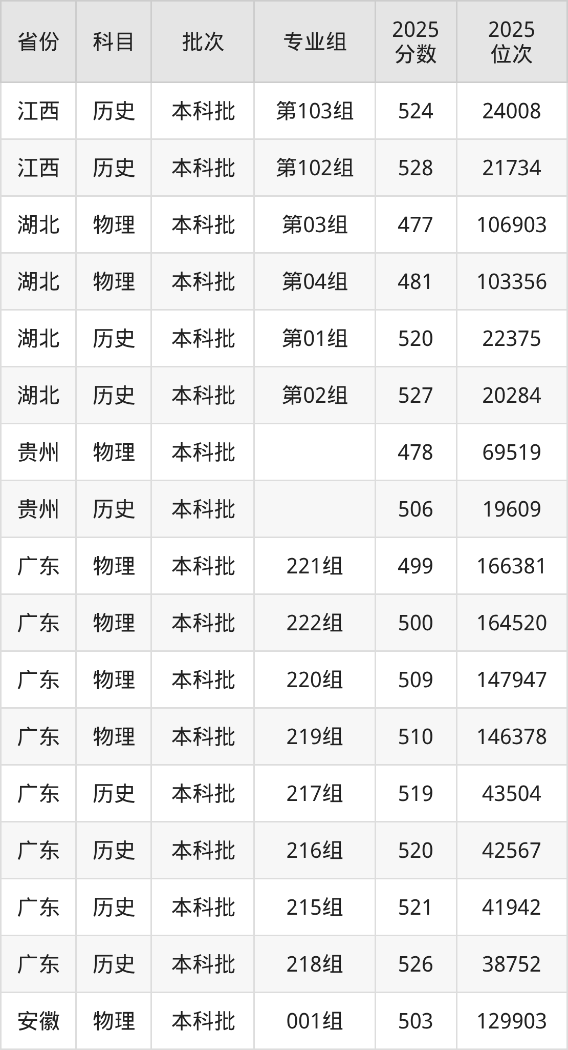 2025年投档录取最低分为478分,录取最低位次为69519名。