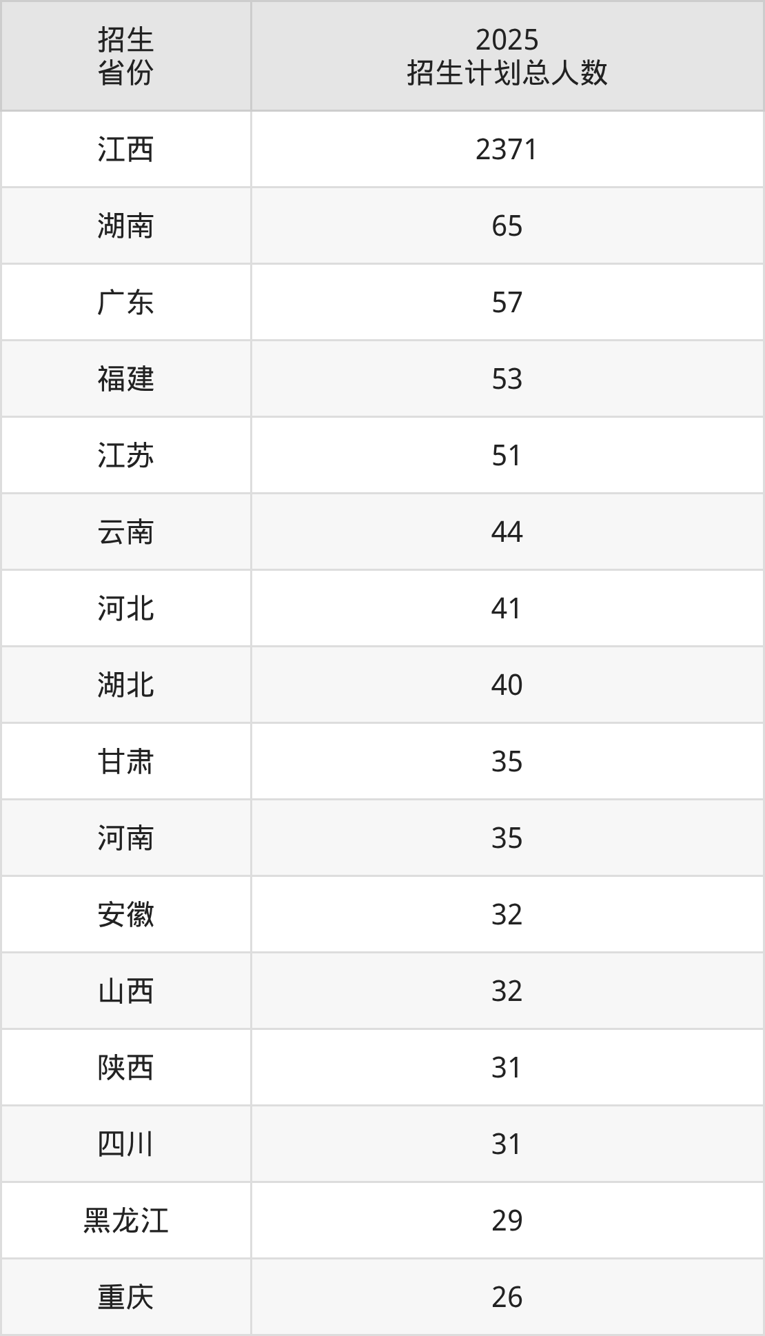 2025年上饶师范学院面向全国28个省市开展本科招生;招生专业共32个,招生人数共3127人。2025年在江西省招生计划总人数是2371人,其中,上饶师范学院在江西省招生人数最多的是生物科学。上饶师范学院在各省具体招生人数情况如下表。