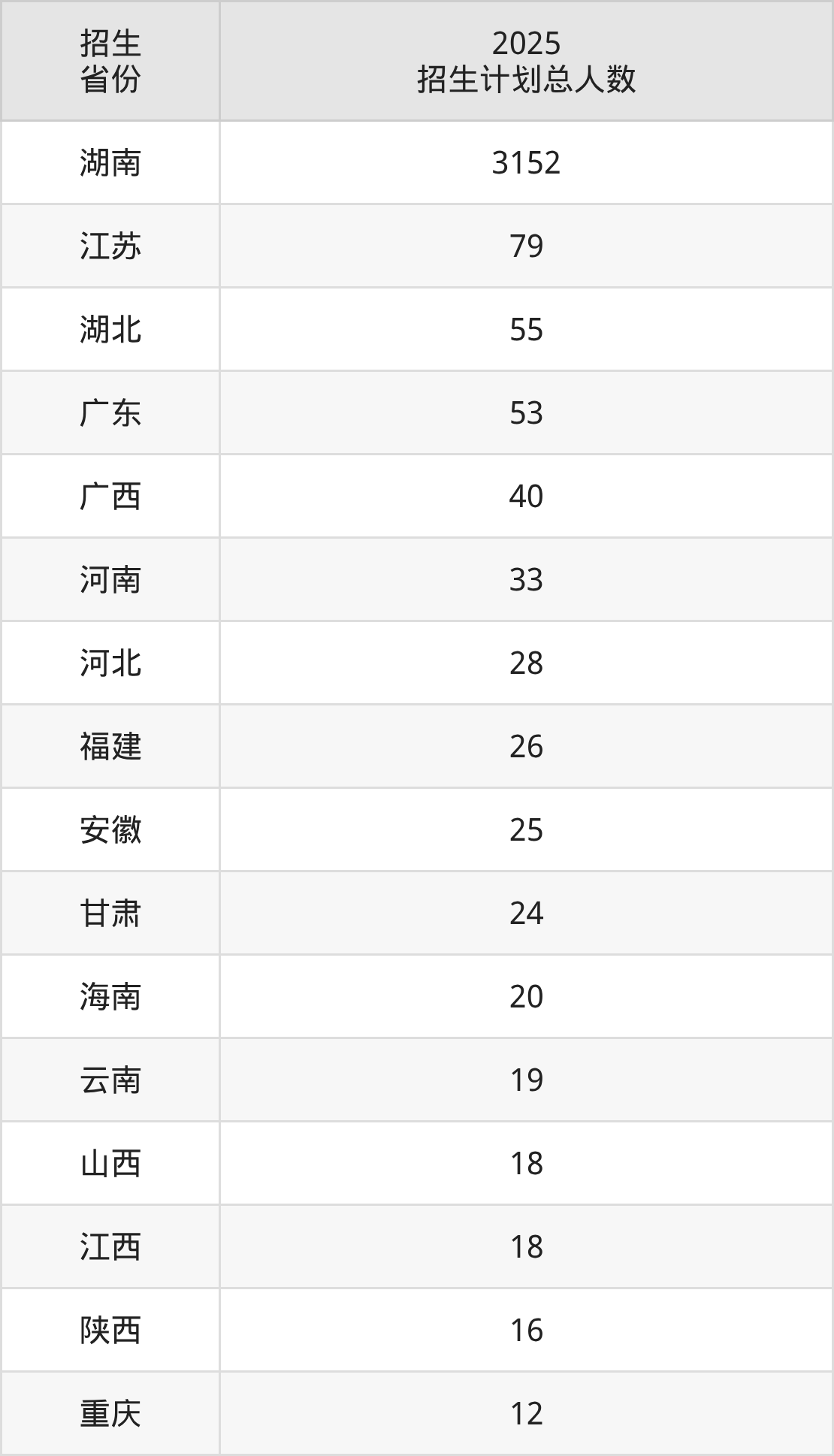 2025年长沙学院面向全国24个省市开展本科招生;招生专业共36个,招生人数共3677人。2025年在湖南省招生计划总人数是3152人,其中,长沙学院在湖南省招生人数最多的是工程管理。长沙学院在各省具体招生人数情况如下表。