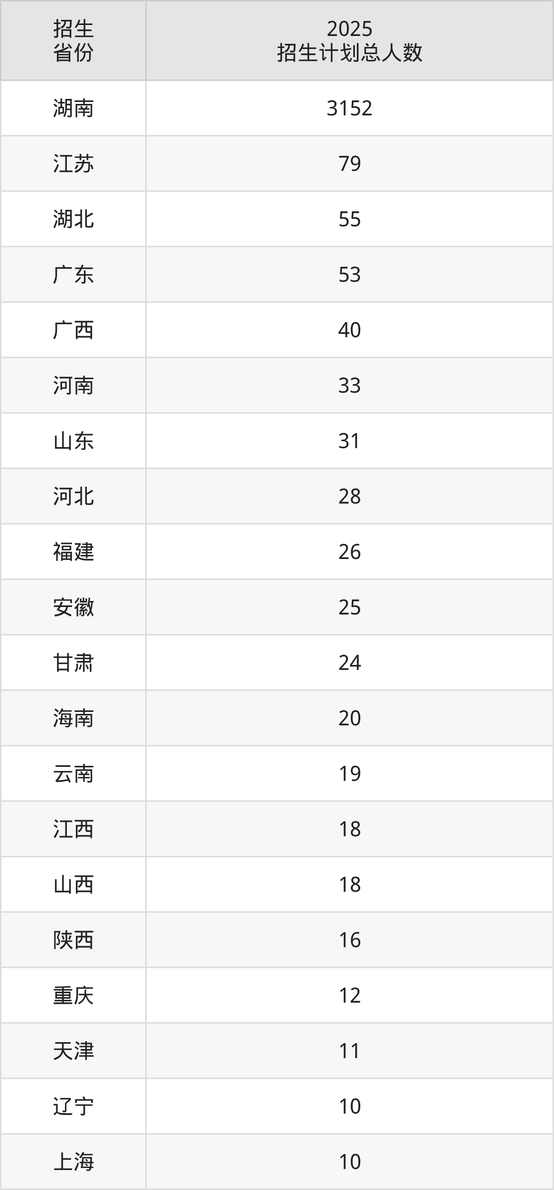 2025年长沙学院面向全国25个省市开展本科招生;招生专业共36个,招生人数共3708人。2025年在湖南省招生计划总人数是3152人,其中,长沙学院在湖南省招生人数最多的是工程管理。长沙学院在各省具体招生人数情况如下表。