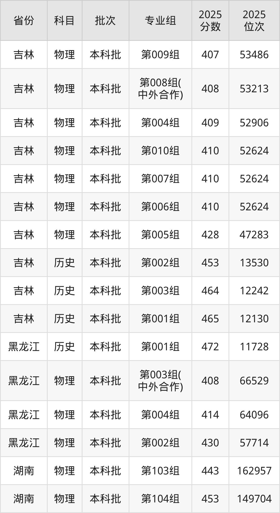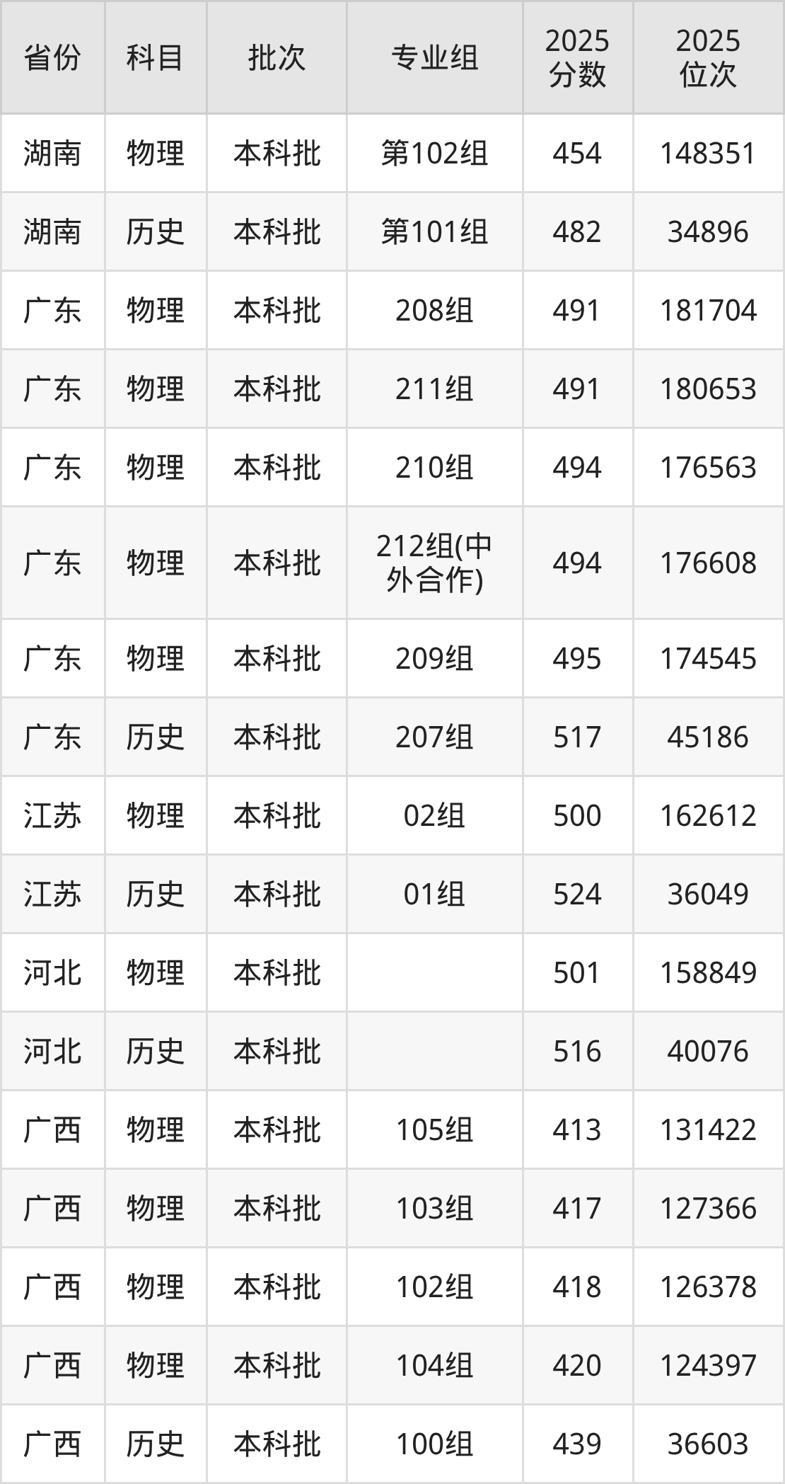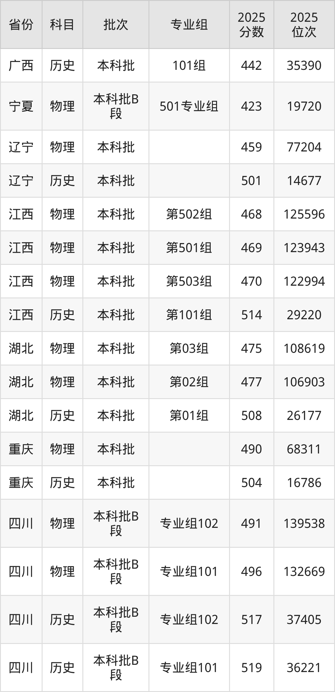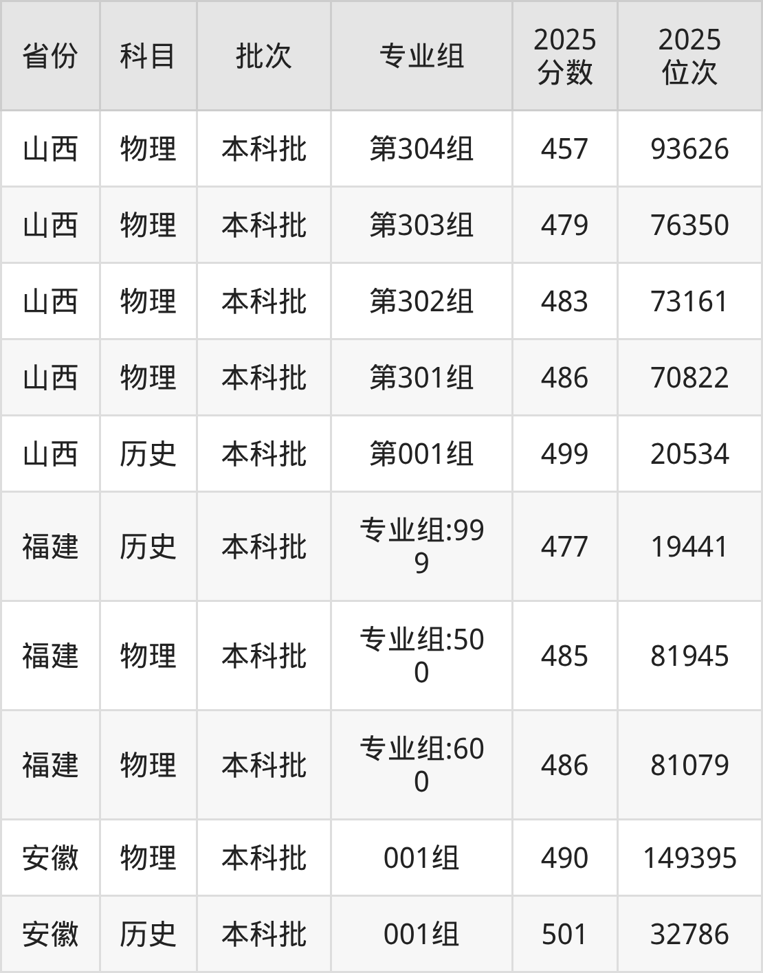 2025年在本科物理类进行招生,各专业组分数线详情如下: