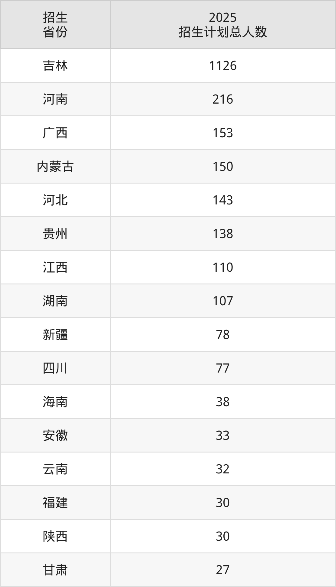 2025年吉林农业科技学院面向全国25个省市开展本科招生;招生专业共35个,招生人数共2639人。2025年在吉林省招生计划总人数是1126人,其中,吉林农业科技学院在吉林省招生人数最多的是中药学类。吉林农业科技学院在各省具体招生人数情况如下表。