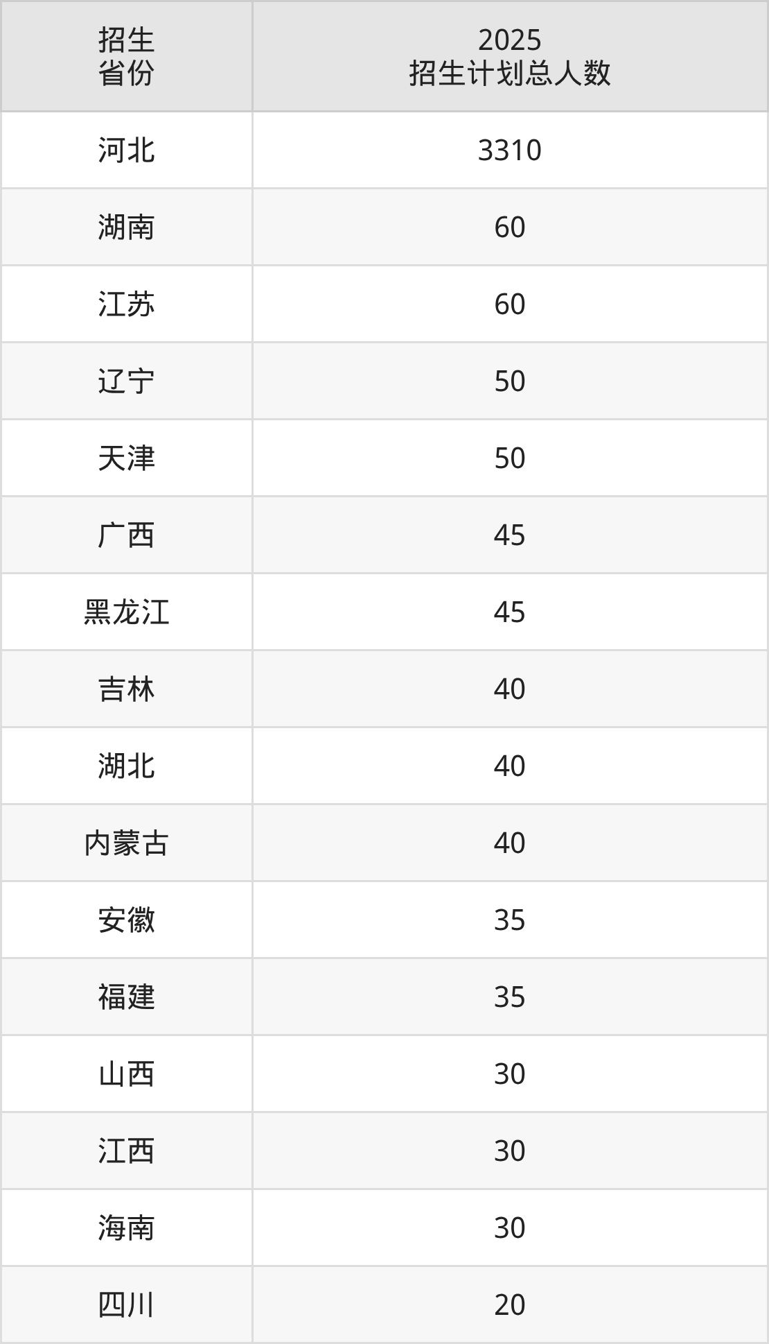 2025年河北科技师范学院面向全国21个省市开展本科招生;招生专业共52个,招生人数共4010人。2025年在河北省招生计划总人数是3310人,其中,河北科技师范学院在河北省招生人数最多的是土木工程。河北科技师范学院在各省具体招生人数情况如下表。
