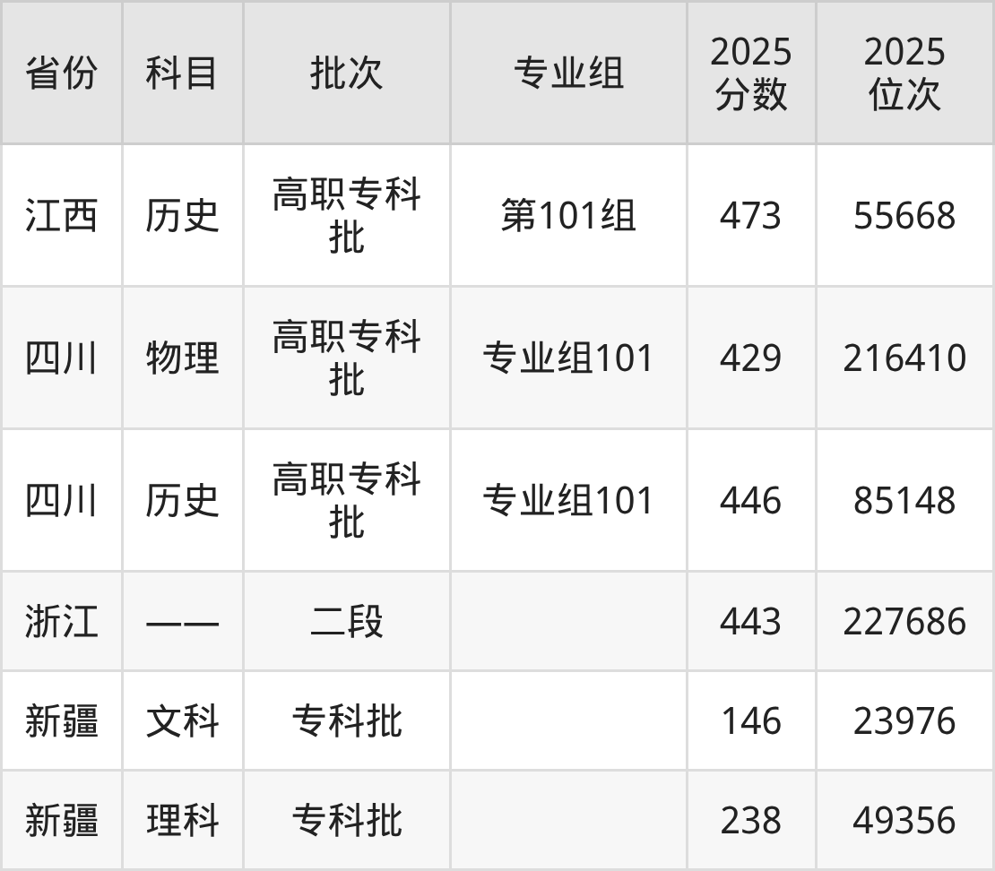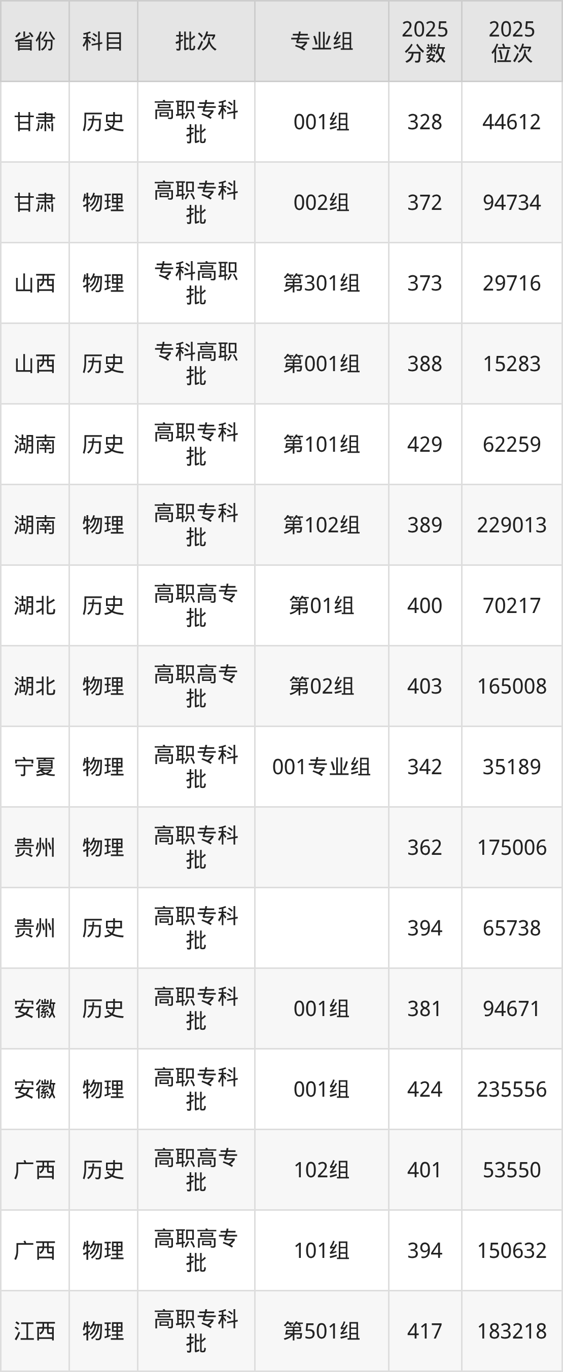 2025年在专科物理类进行招生,各专业组分数线详情如下: