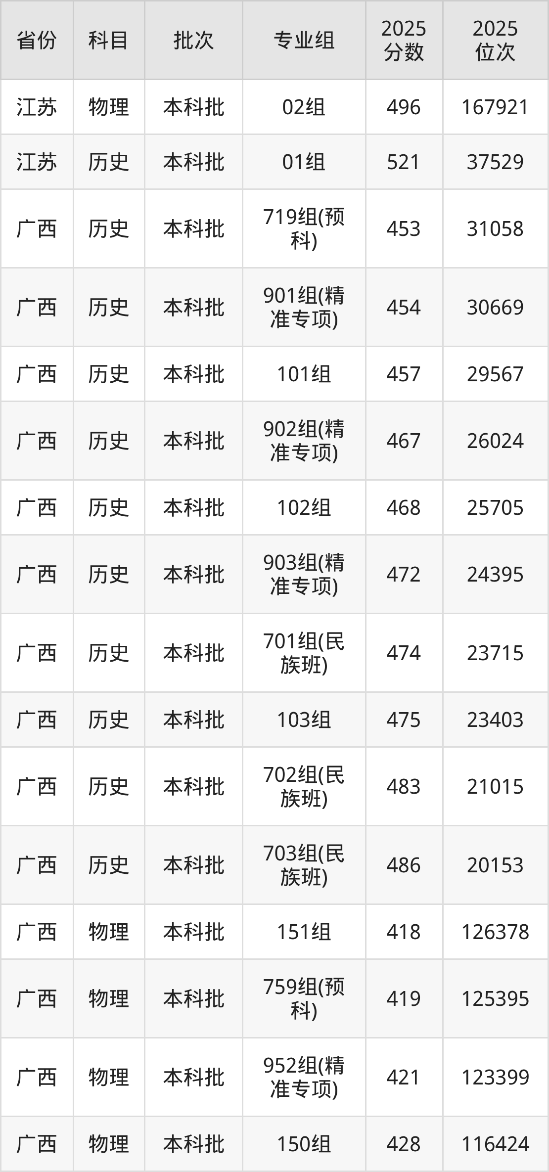 广西民族师范学院第001组:2025年投档录取最低分为490分,录取最低位次为23133名。