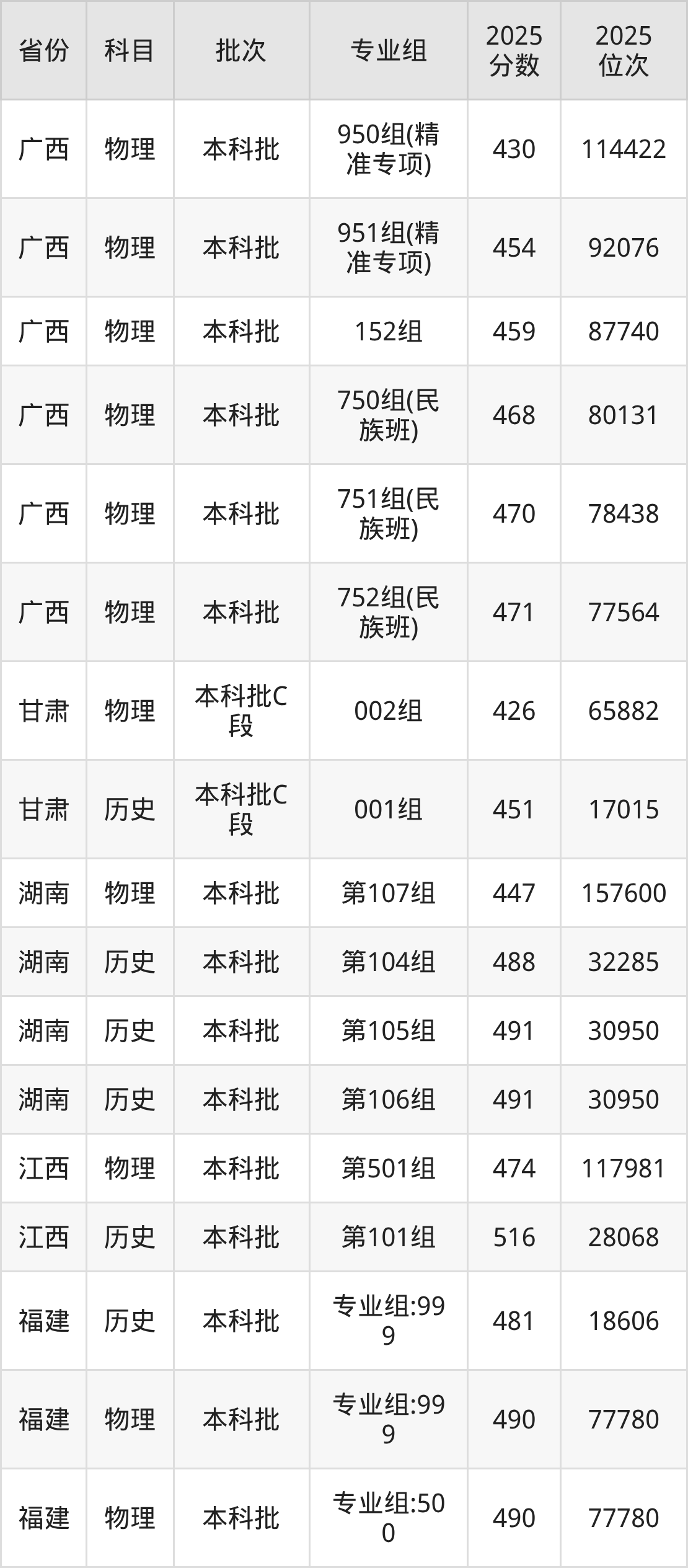 广西民族师范学院950组(精准专项):2025年投档录取最低分为430分,录取最低位次为114422名。
