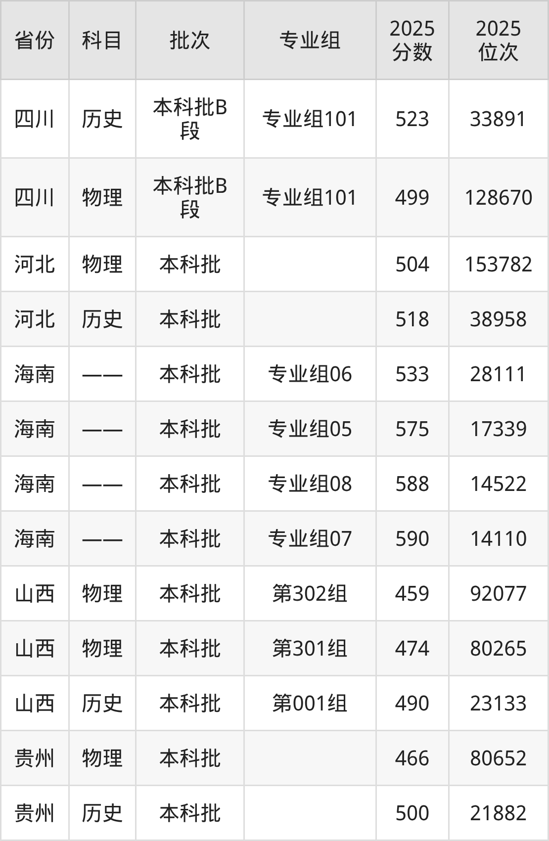 2025年投档录取最低分为466分,录取最低位次为80652名。