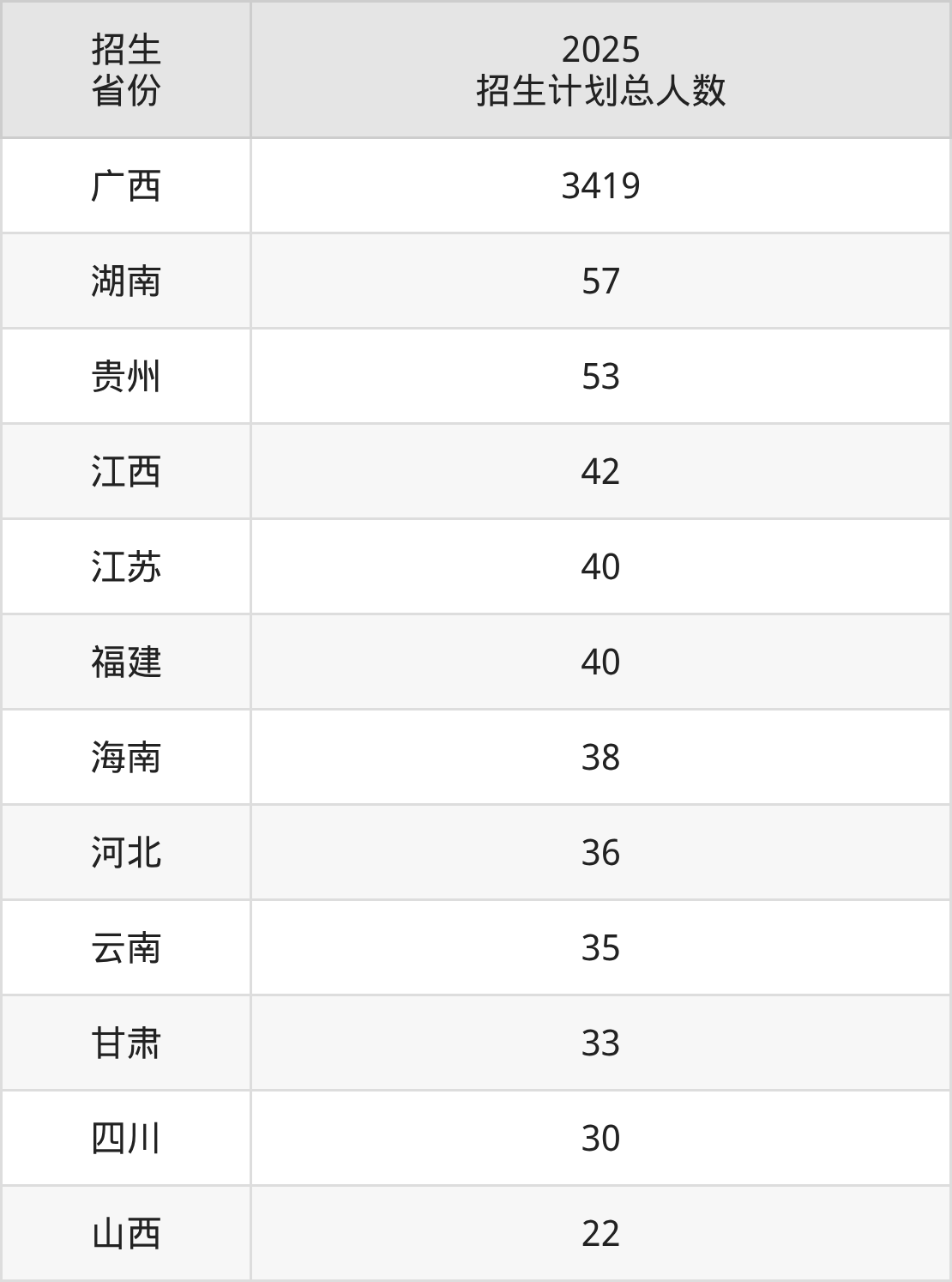 2025年广西民族师范学院面向全国12个省市开展本科招生;招生专业共40个,招生人数共3845人。