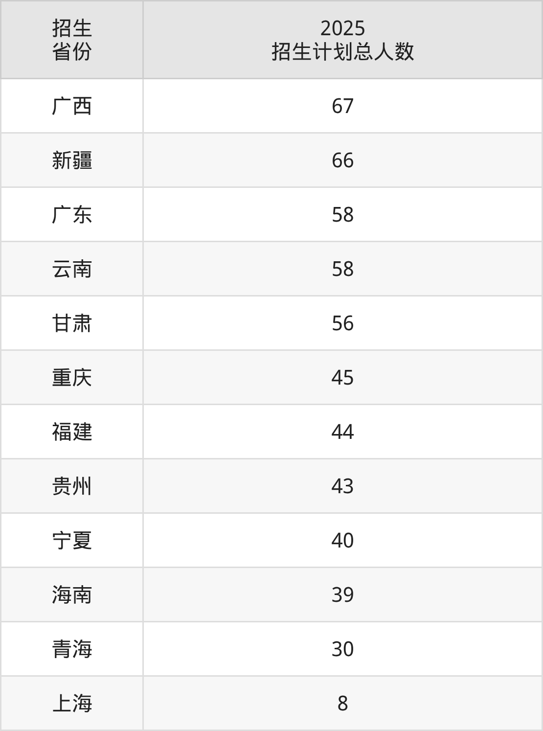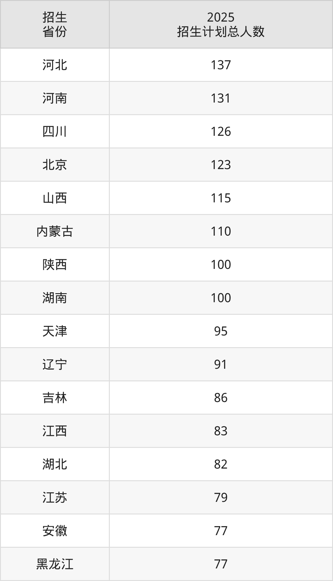2025年中国地质大学(北京)面向全国28个省市开展本科招生;招生专业共45个,招生人数共2165人。2025年在北京市招生计划总人数是123人,其中,中国地质大学(北京)在北京市招生人数最多的是地质学类。中国地质大学(北京)在各省具体招生人数情况如下表。
