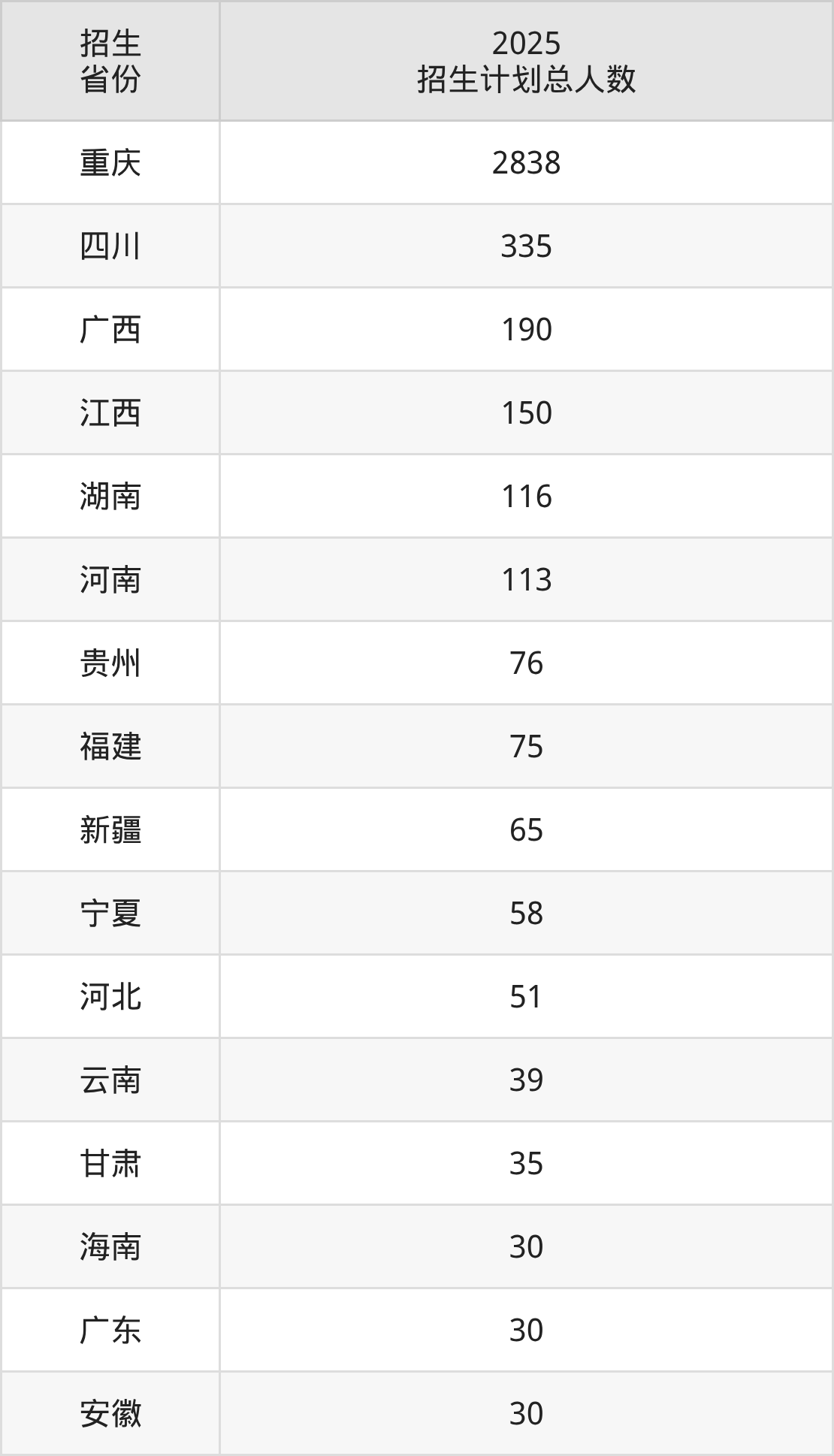 2025年重庆外语外事学院面向全国27个省市开展本科招生;招生专业共23个,招生人数共4440人。2025年在重庆市招生计划总人数是2838人,其中,重庆外语外事学院在重庆市招生人数最多的是新闻传播学类。重庆外语外事学院在各省具体招生人数情况如下表。