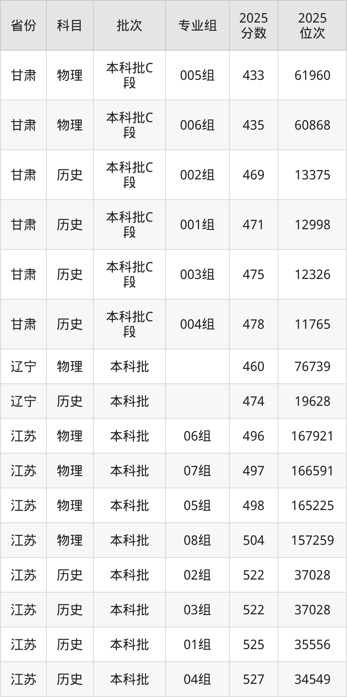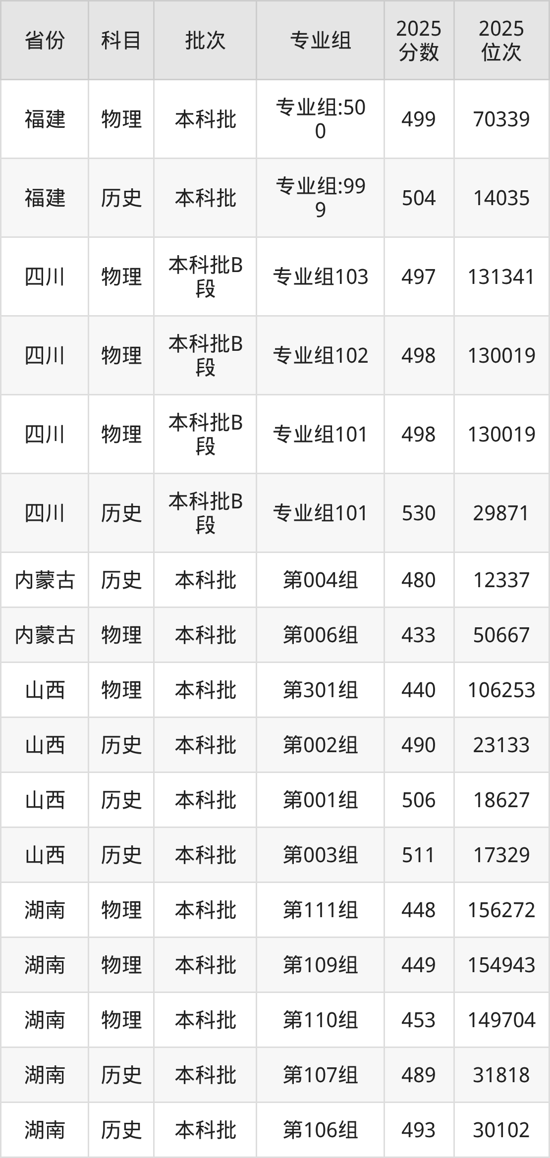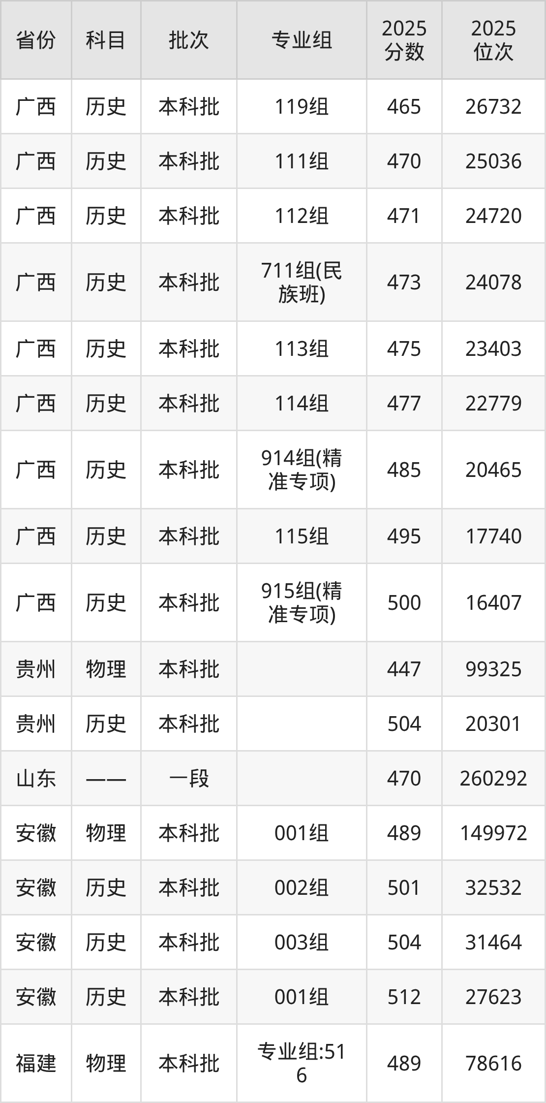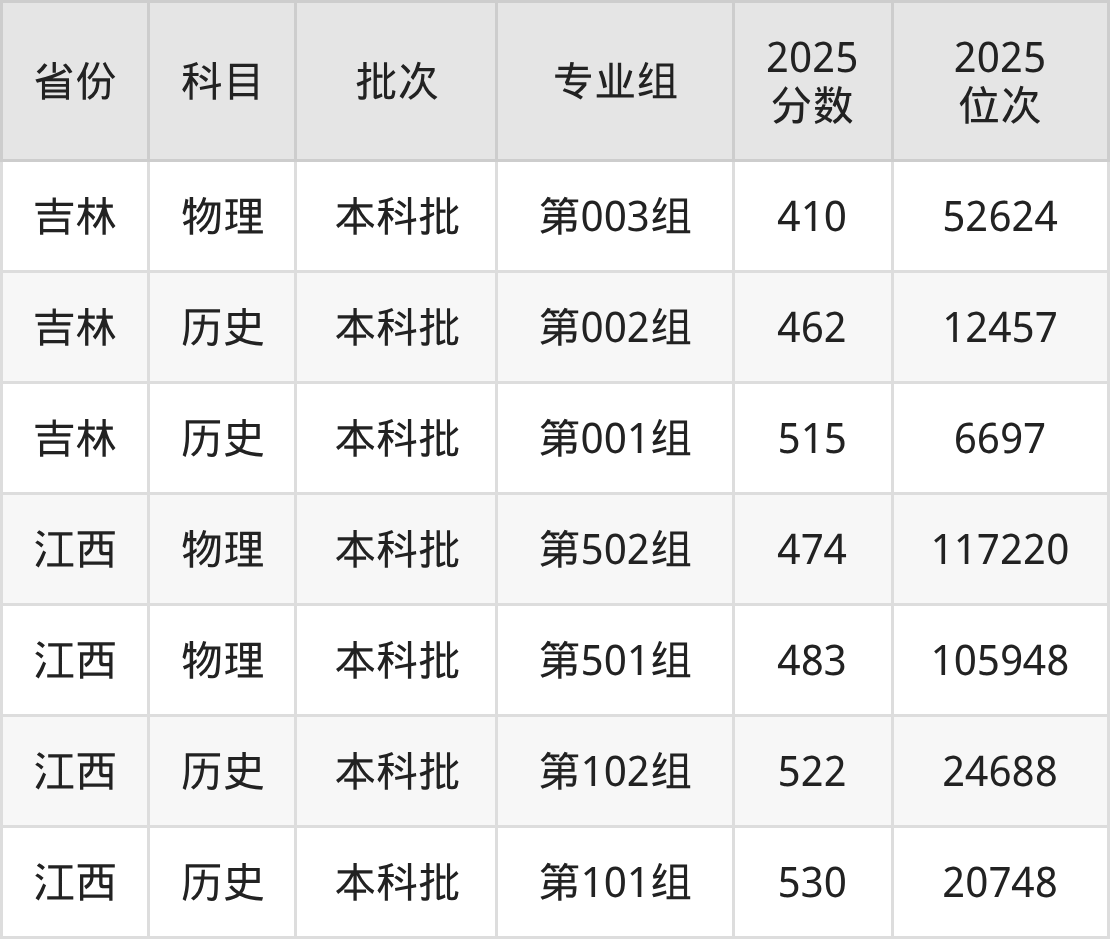 2025年在本科物理类进行招生,各专业组分数线详情如下: