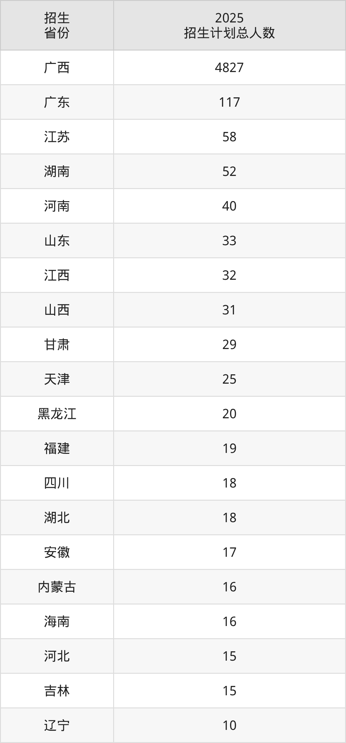 2025年玉林师范学院面向全国24个省市开展本科招生;招生专业共46个,招生人数共5440人。2025年在广西壮族自治区招生计划总人数是4827人,其中,玉林师范学院在广西壮族自治区招生人数最多的是汉语言文学。玉林师范学院在各省具体招生人数情况如下表。
