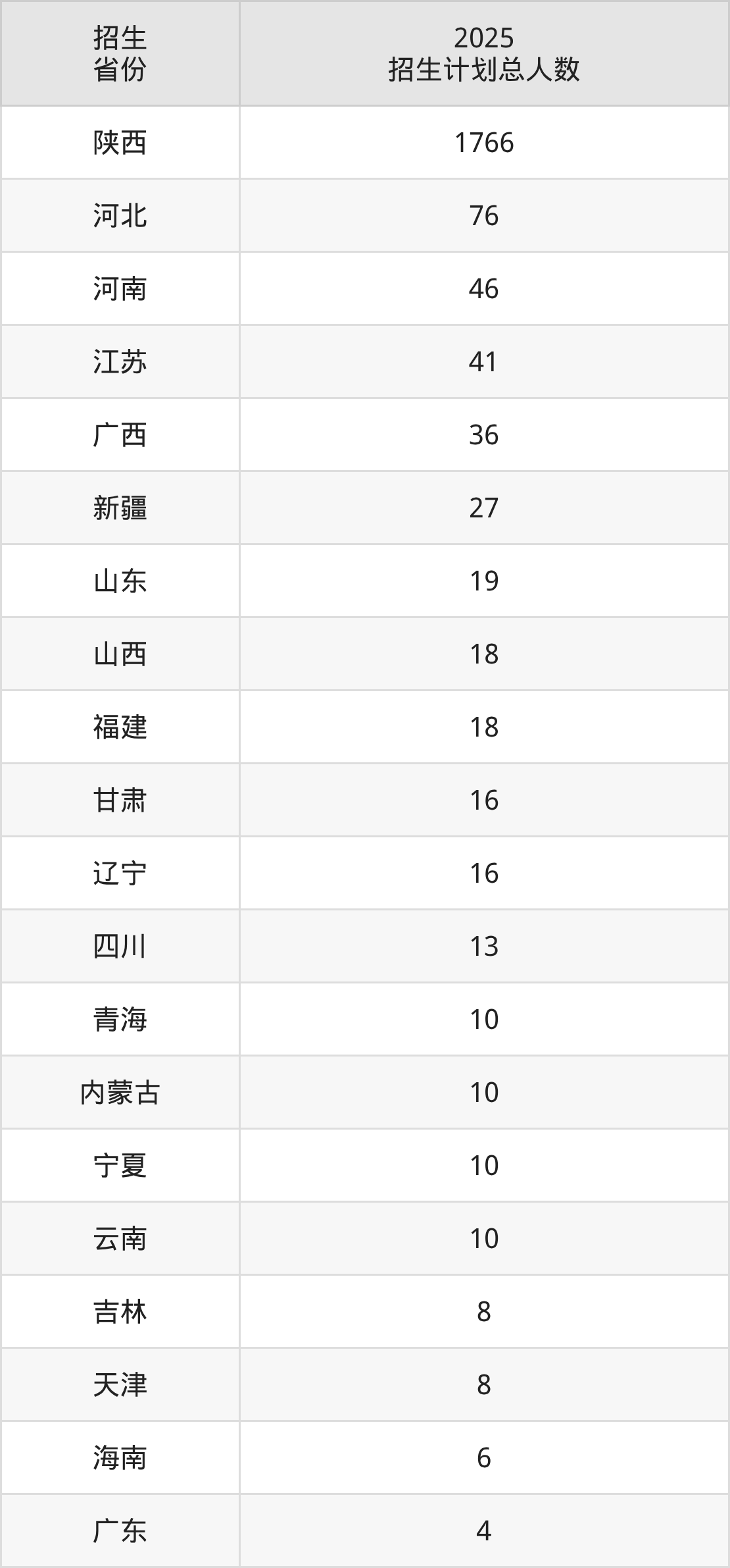 2025年西安交通大学城市学院面向全国25个省市开展本科招生;招生专业共21个,招生人数共2172人。2025年在陕西省招生计划总人数是1766人,其中,西安交通大学城市学院在陕西省招生人数最多的是计算机科学与技术。西安交通大学城市学院在各省具体招生人数情况如下表。