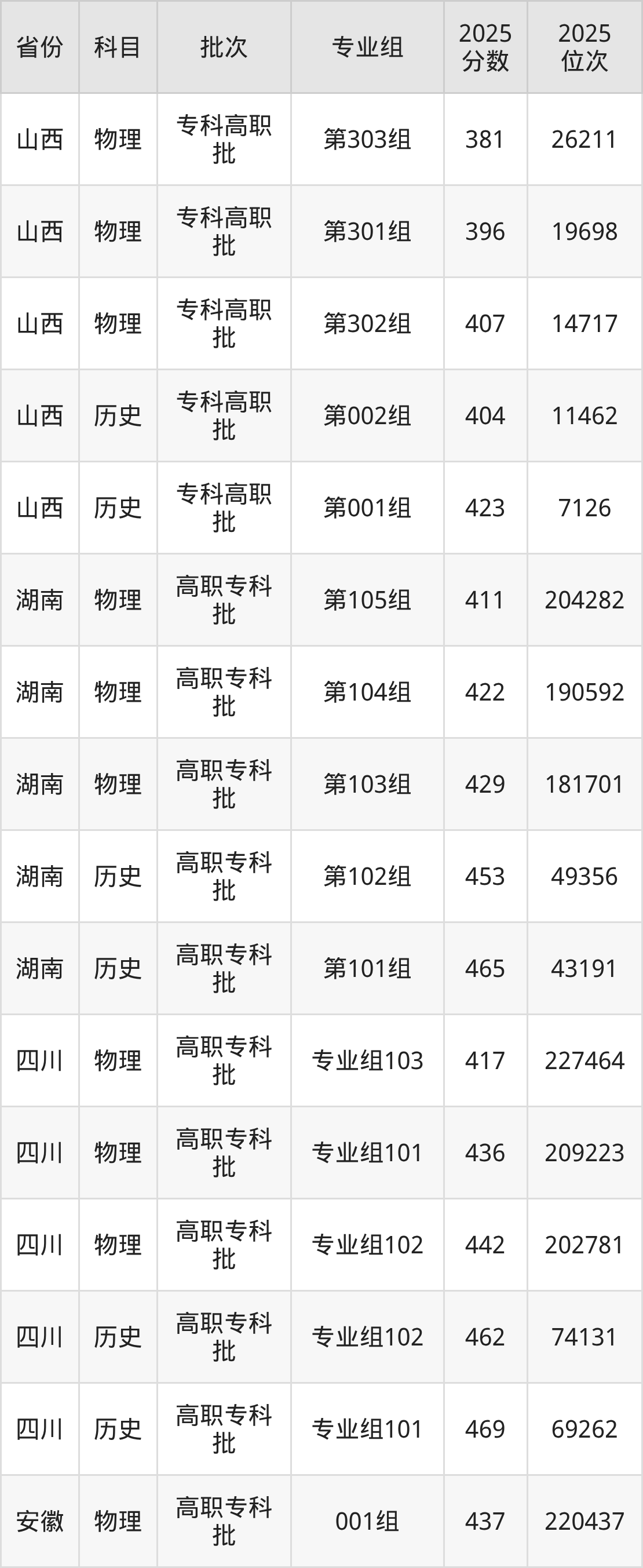普通类专科物理类最低381分,专科历史类最低404分