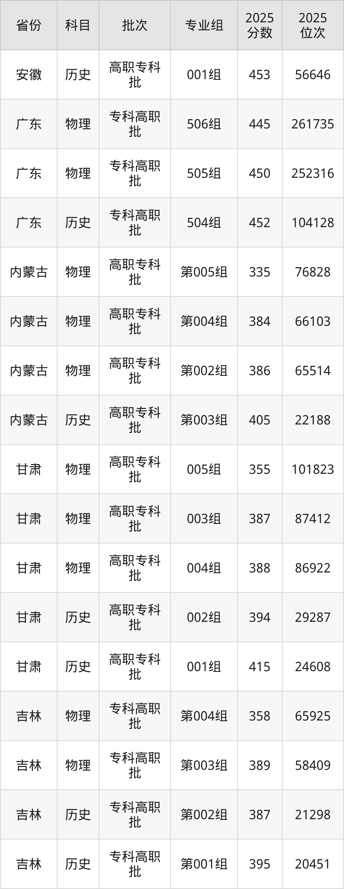 普通类专科历史类最低452分,专科物理类最低445分