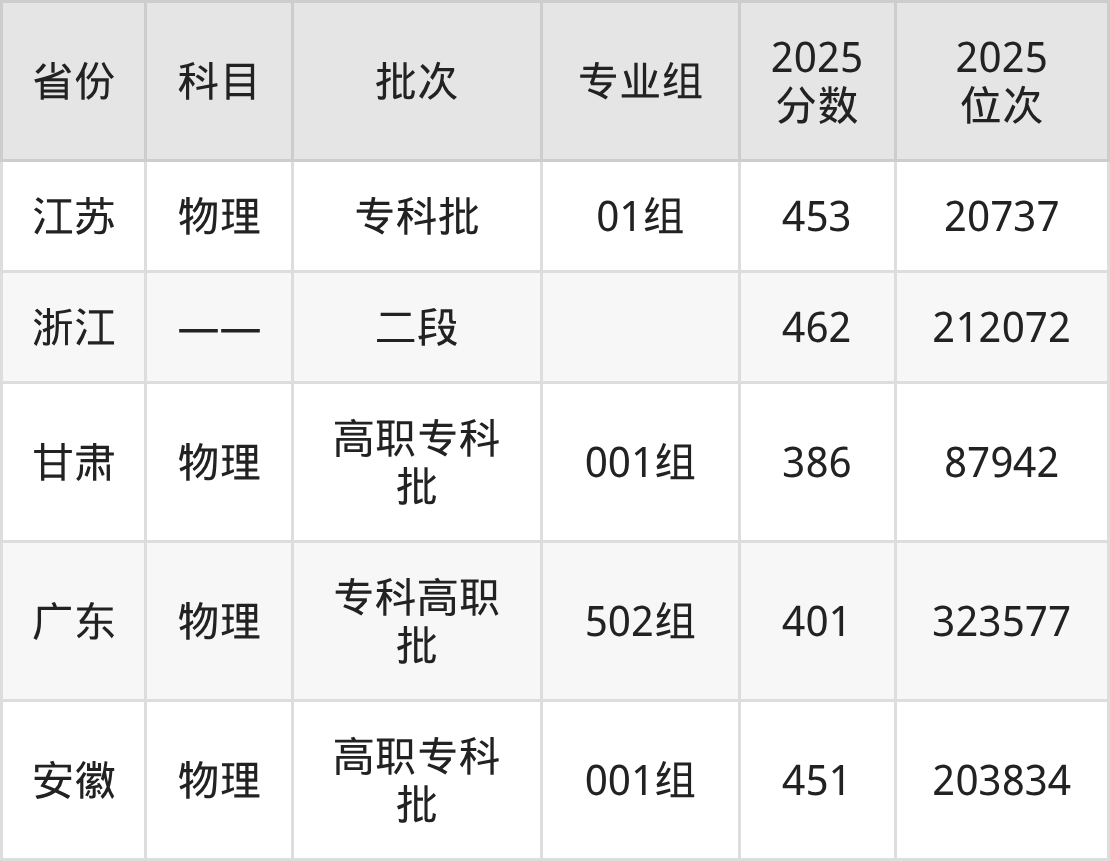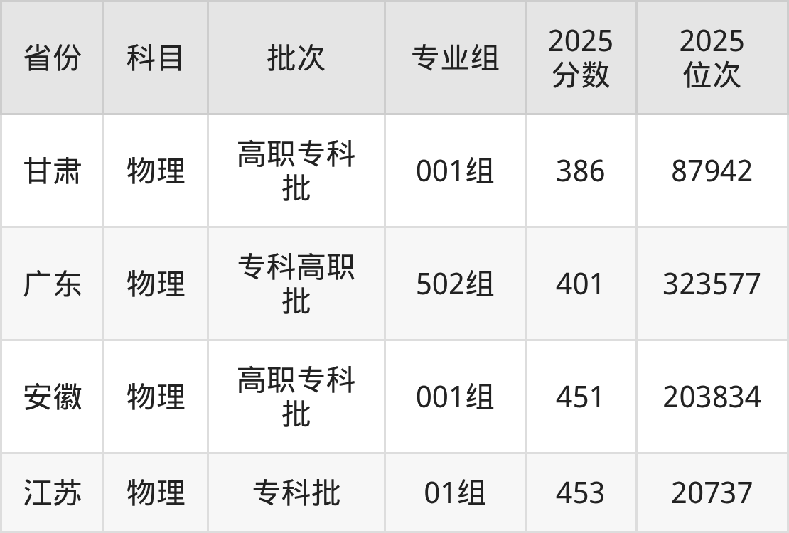 2025年在专科物理类进行招生,各专业组分数线详情如下: