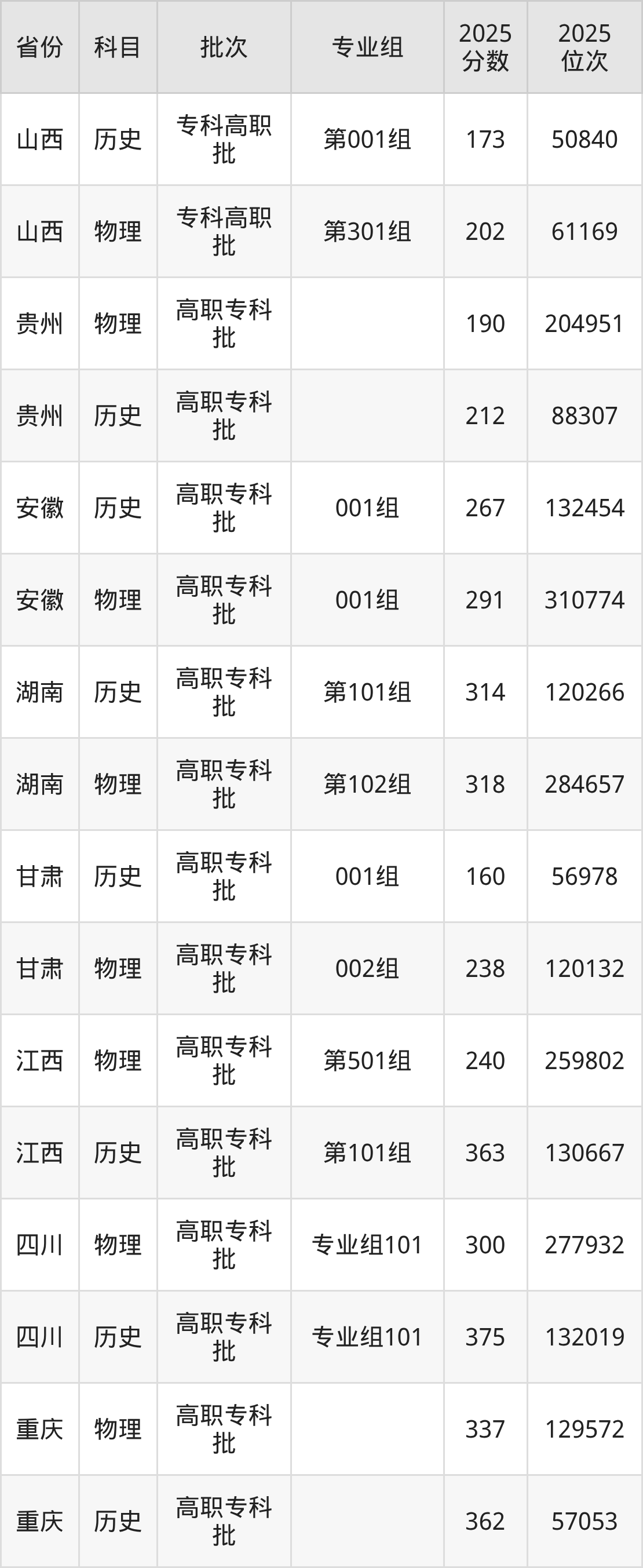 普通类专科历史类最低173分,专科物理类最低202分