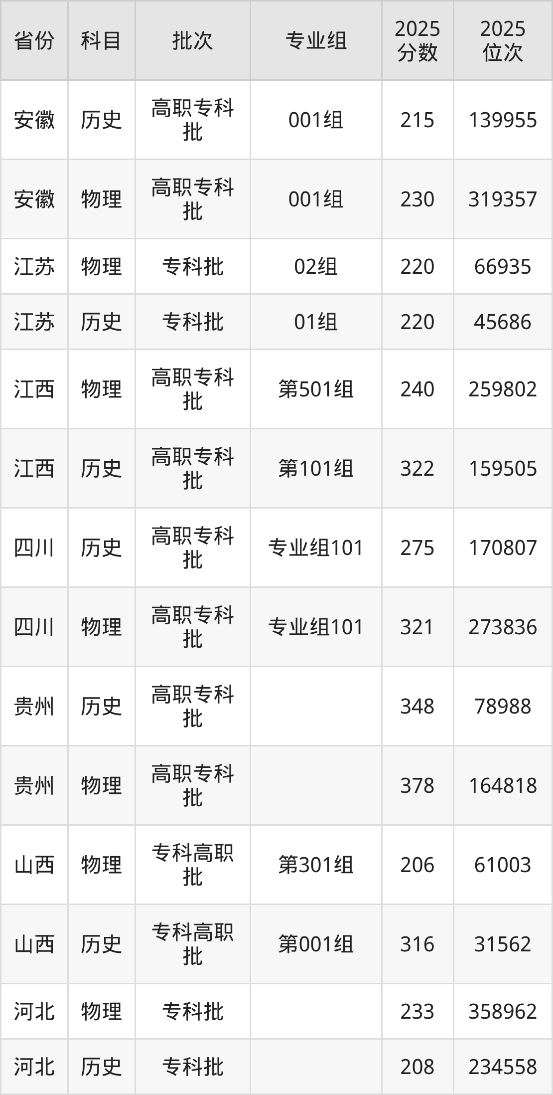 2025年无锡南洋职业技术学院全国录取分数线是206分到378分,录取最低在山西物理类(第301组)、录取最高在贵州物理类。各省各专业组最低分具有差异,详情如下: