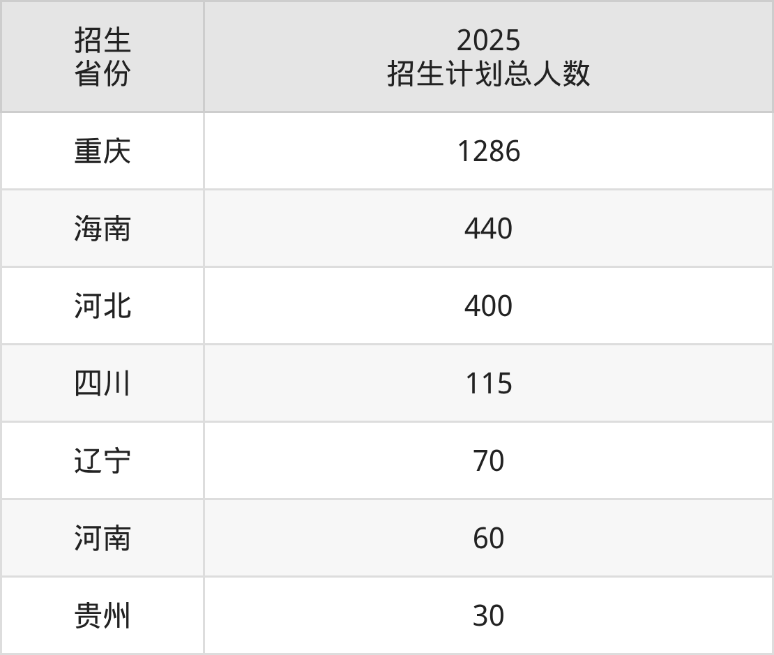 2025年重庆资源与环境保护职业学院面向全国7个省市开展专科招生;招生专业共28个,招生人数共2401人。2025年在重庆市招生计划总人数是1286人,其中,重庆资源与环境保护职业学院在重庆市招生人数最多的是康复治疗技术。重庆资源与环境保护职业学院在各省具体招生人数情况如下表。