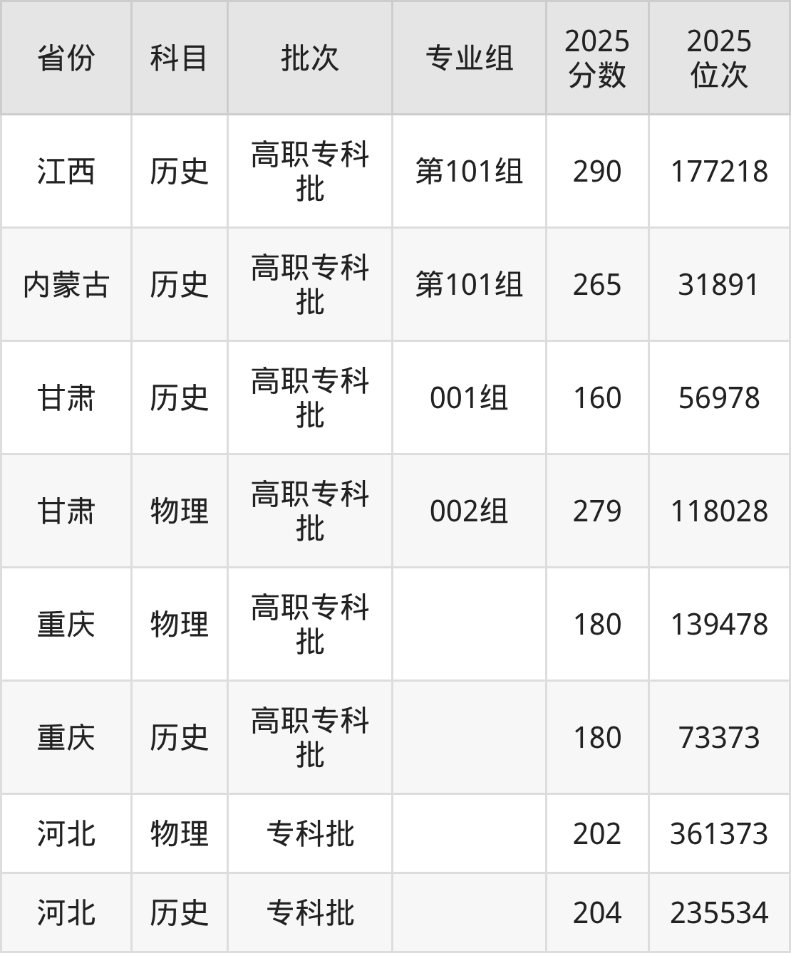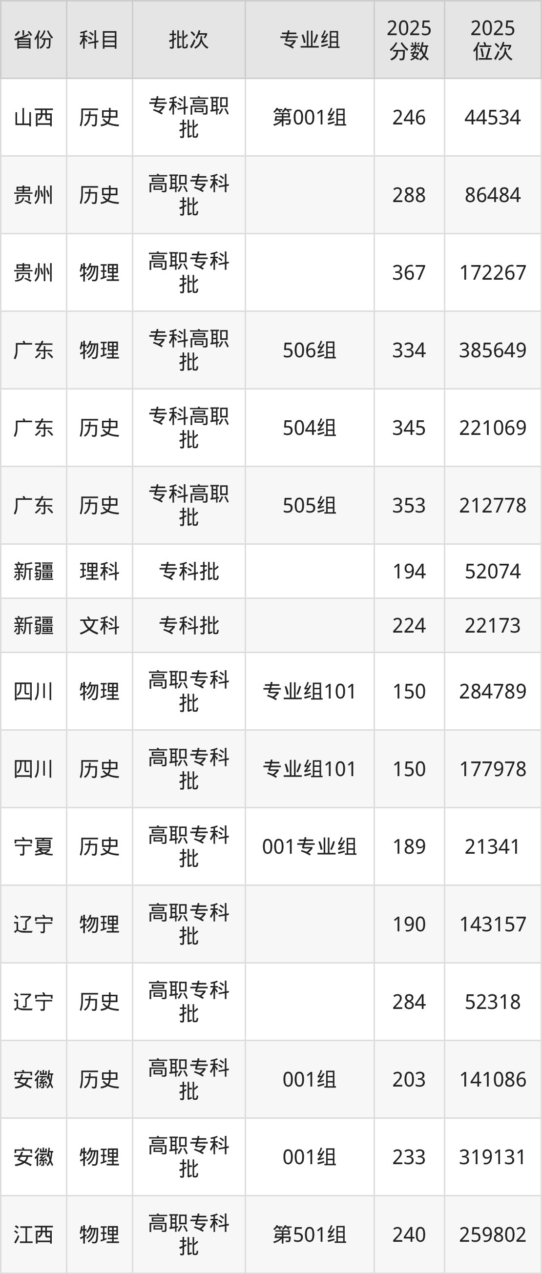 2025年在专科历史类进行招生,各专业组分数线详情如下: