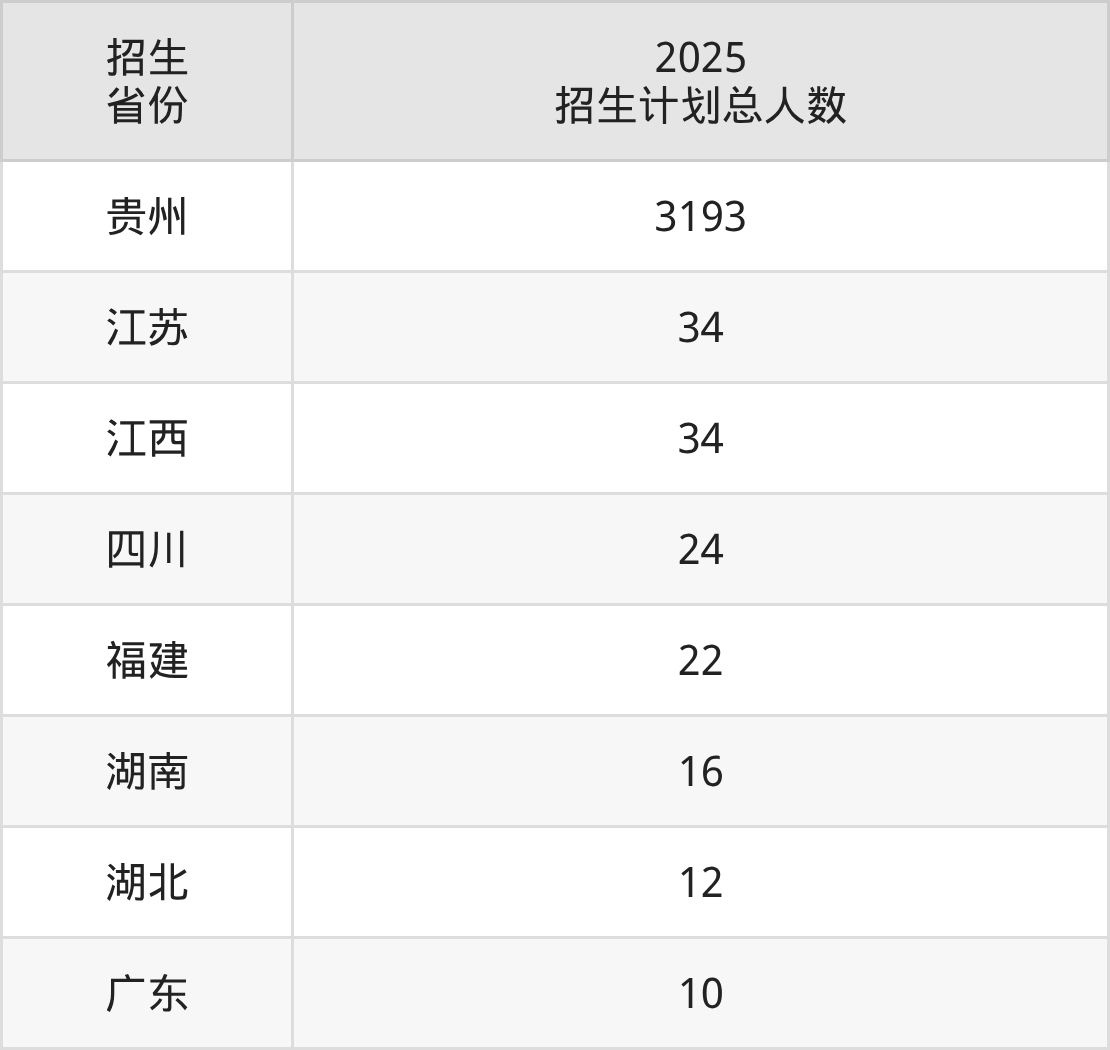 2025年贵阳人文科技学院面向全国8个省市开展本科招生;招生专业共32个,招生人数共3345人。2025年在贵州省招生计划总人数是3193人,其中,贵阳人文科技学院在贵州省招生人数最多的是数据科学与大数据技术。贵阳人文科技学院在各省具体招生人数情况如下表。