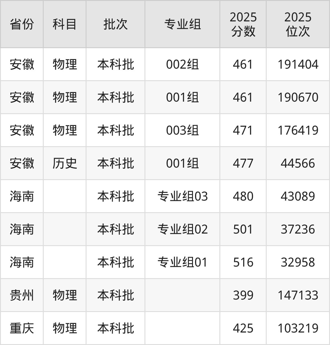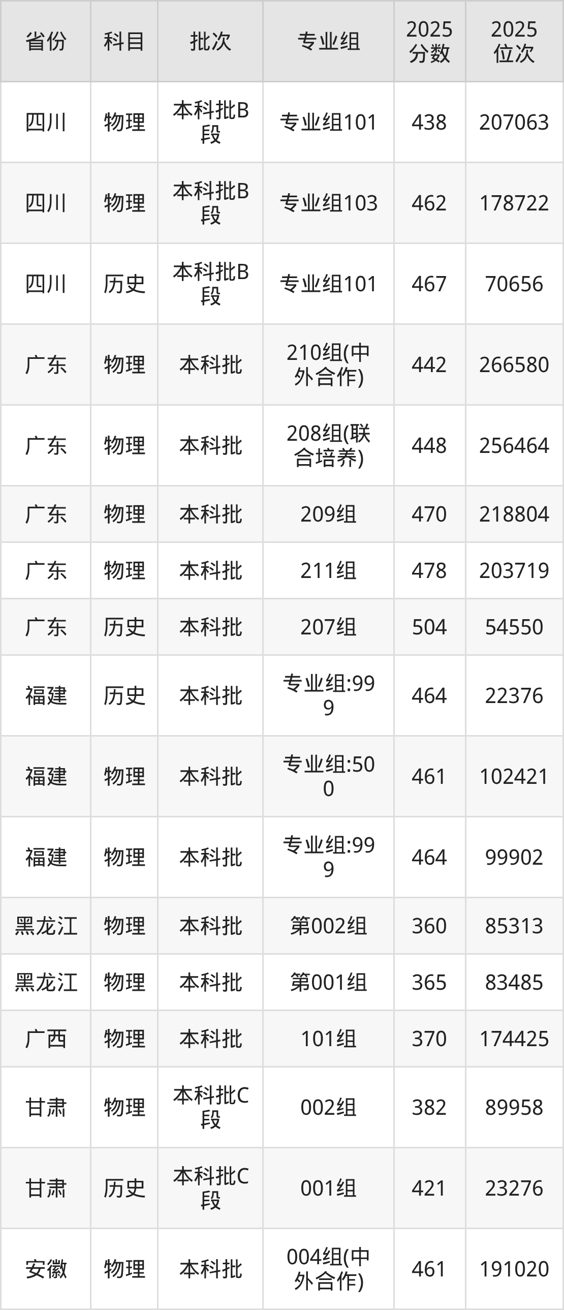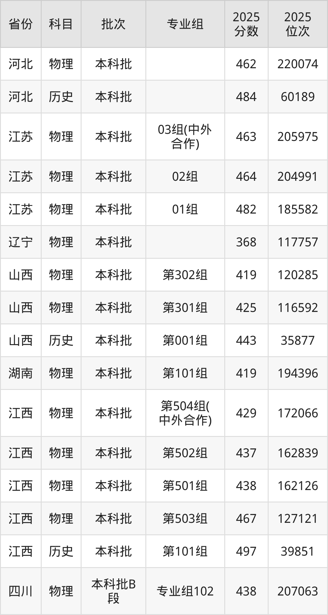 2025年在本科物理类进行招生,各专业组分数线详情如下: