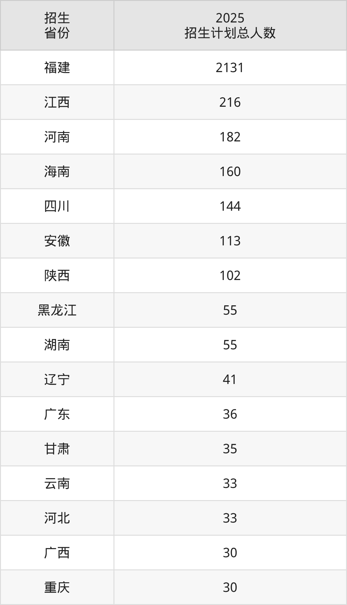 2025年泉州信息工程学院面向全国19个省市开展本科招生;招生专业共24个,招生人数共3462人。2025年在福建省招生计划总人数是2131人,其中,泉州信息工程学院在福建省招生人数最多的是软件工程。泉州信息工程学院在各省具体招生人数情况如下表。