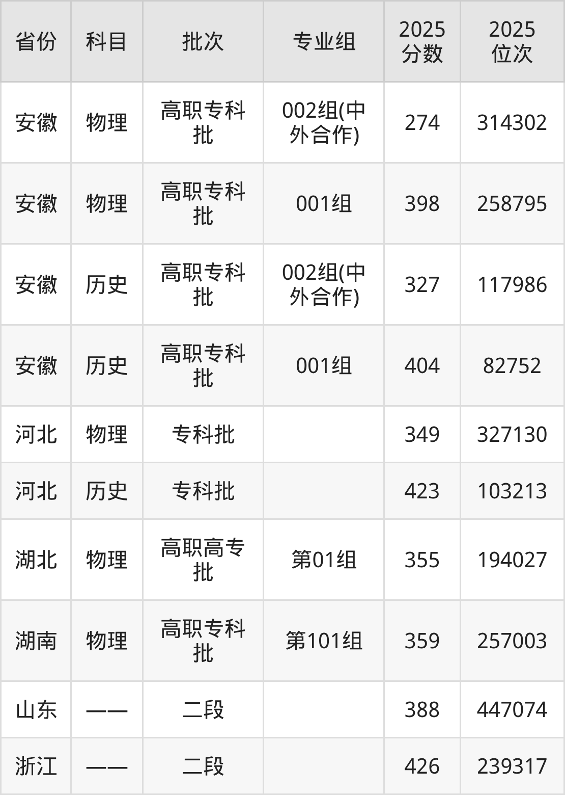 2025年铜陵职业技术学院全国录取分数线是274分到426分,录取最低在安徽物理类(002组(中外合作))、录取最高在浙江。各省各专业组最低分具有差异,详情如下: