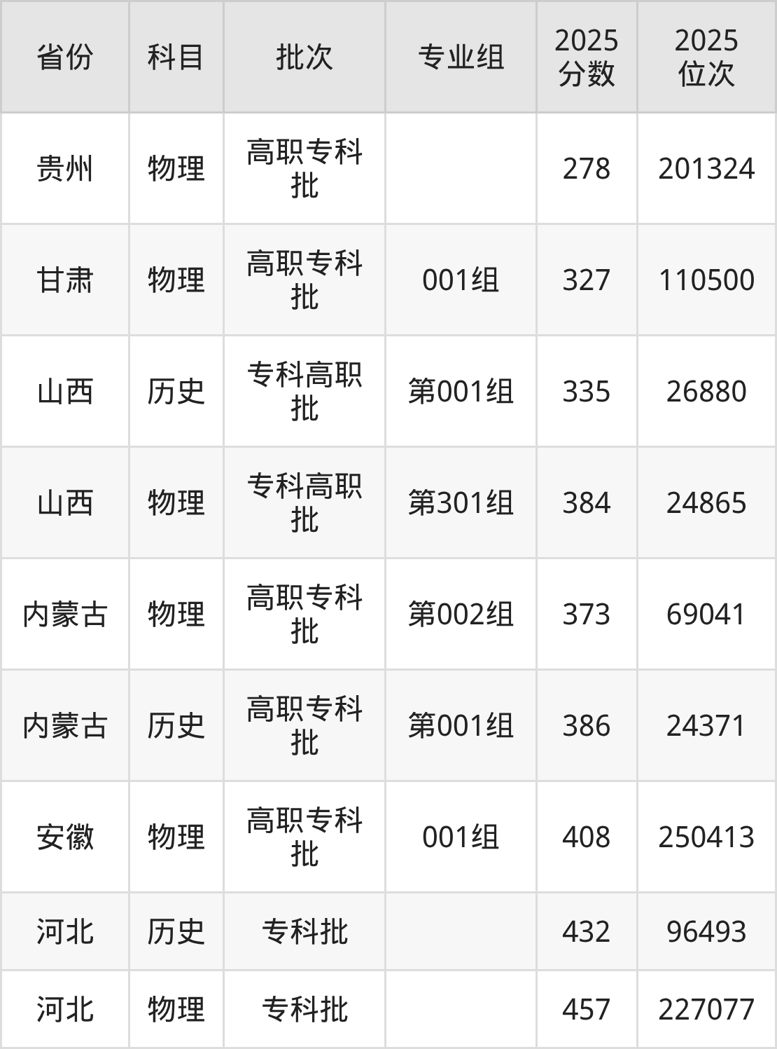 潍坊职业学院第002组:2025年投档录取最低分为373分,录取最低位次为69041名。
