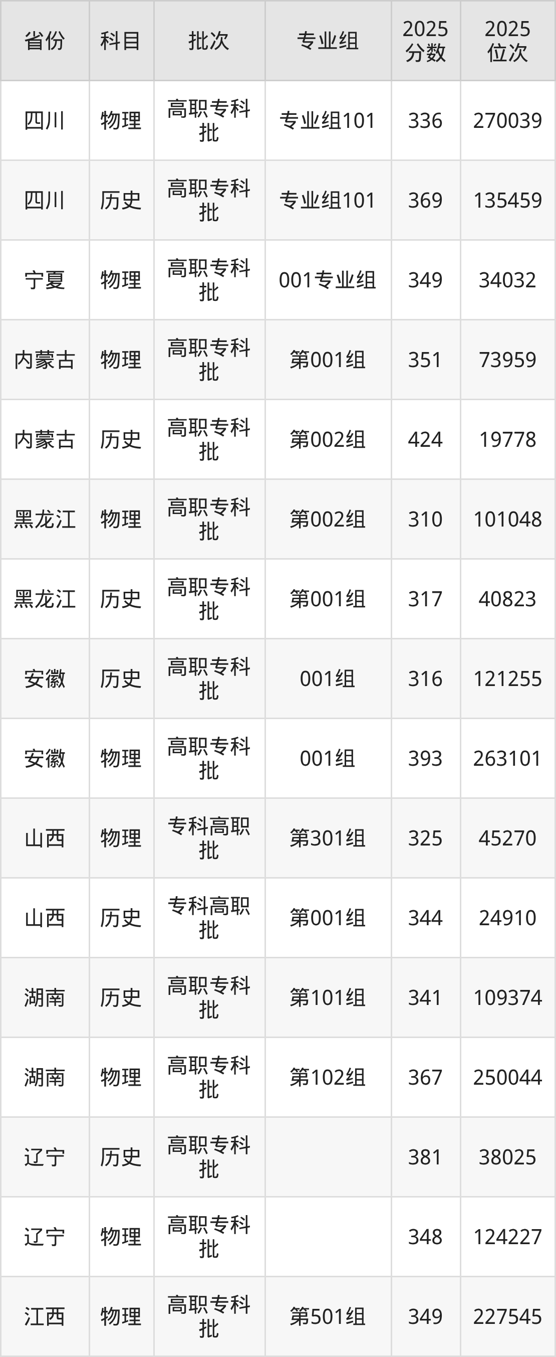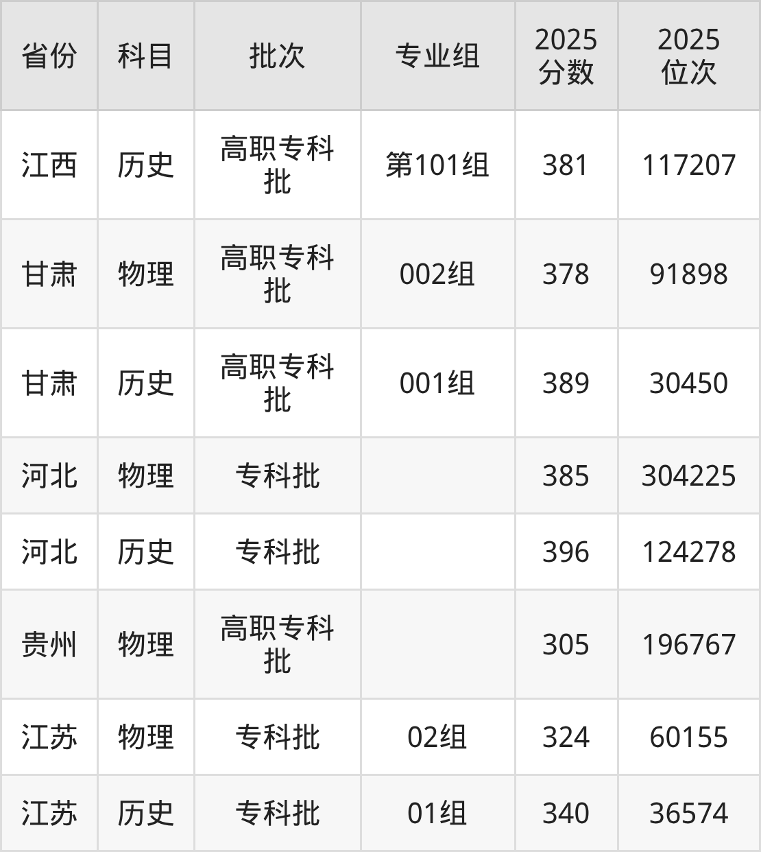 2025年在专科物理类进行招生,各专业组分数线详情如下: