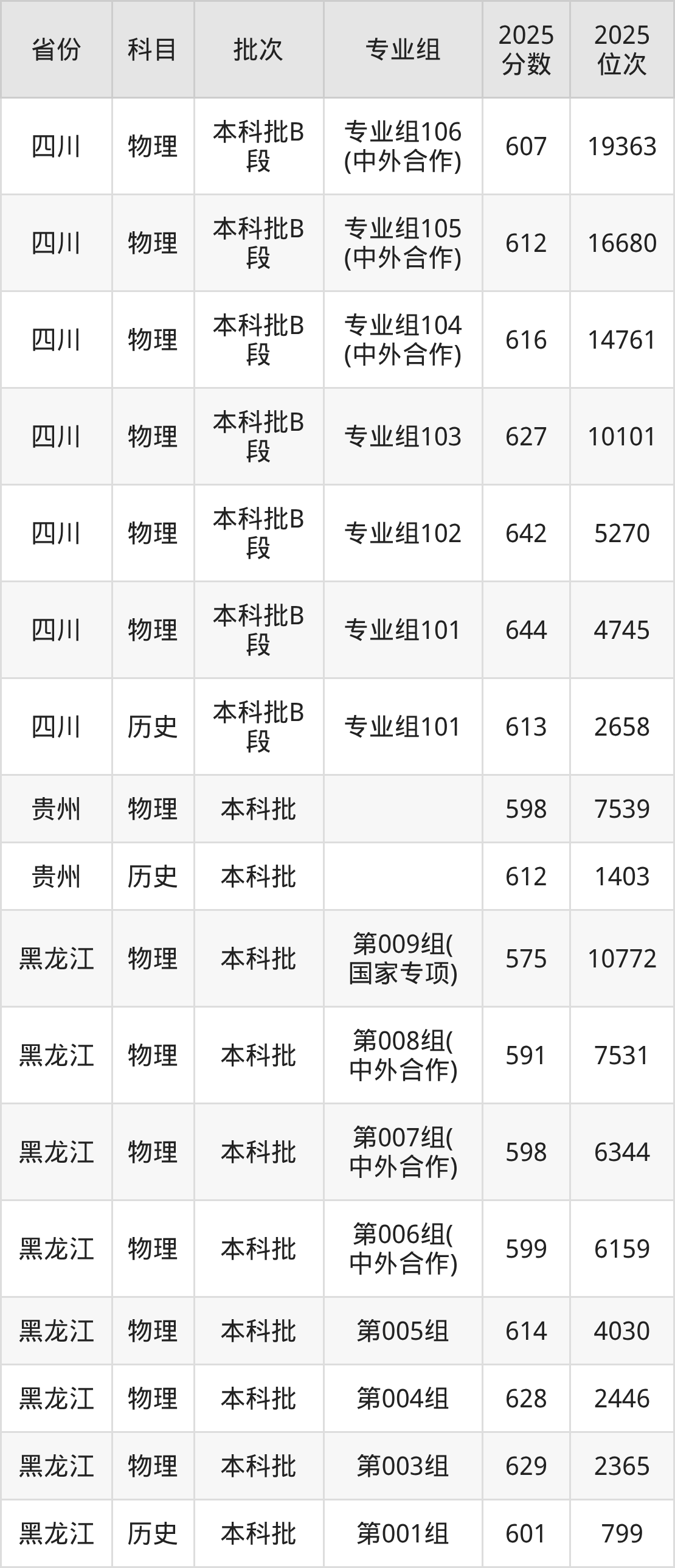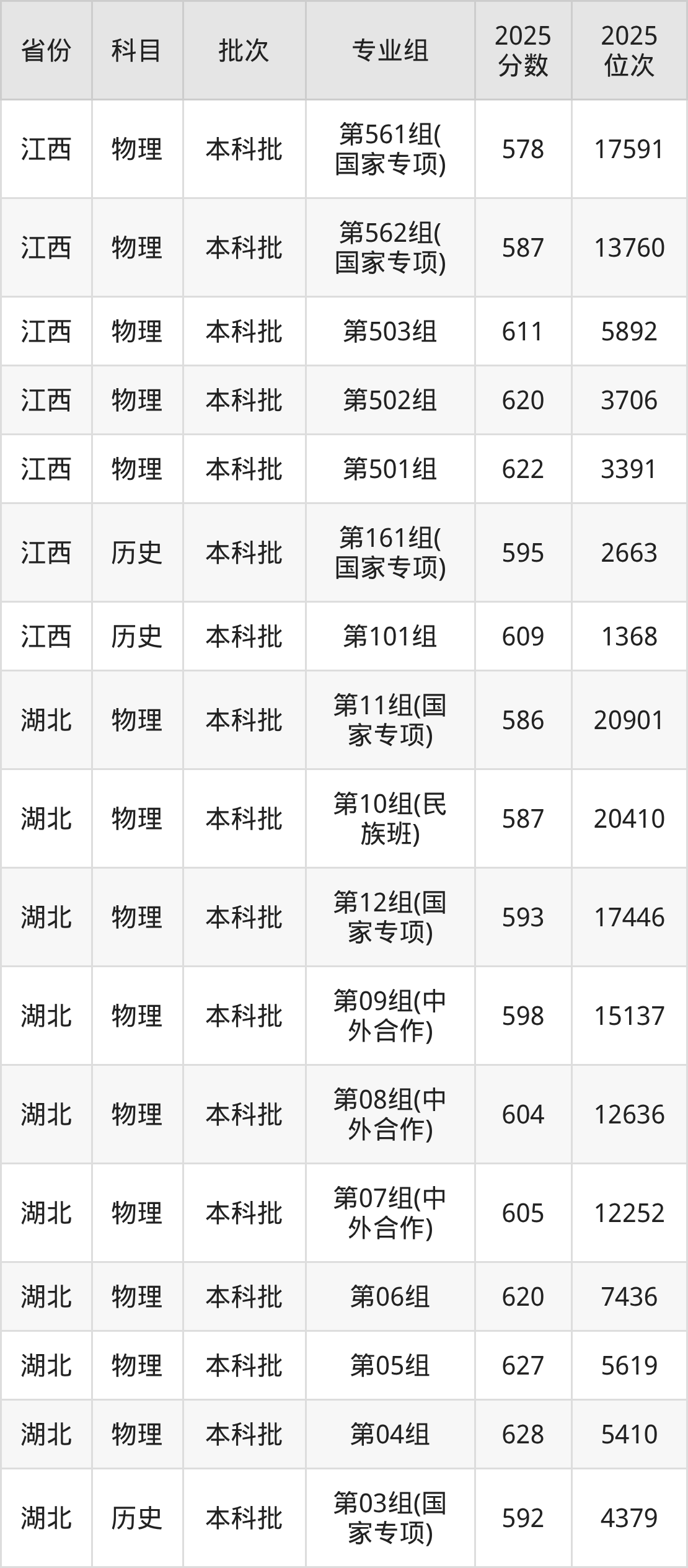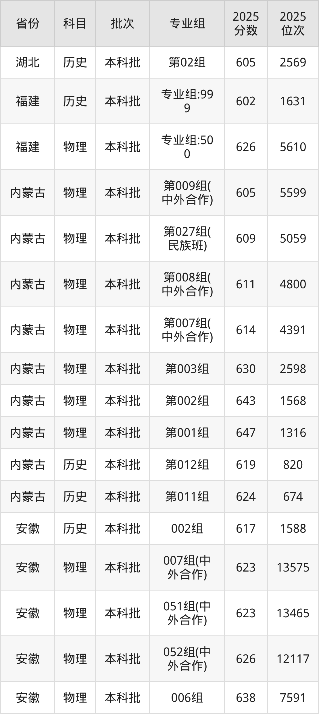2025年在本科物理类进行招生,各专业组分数线详情如下: