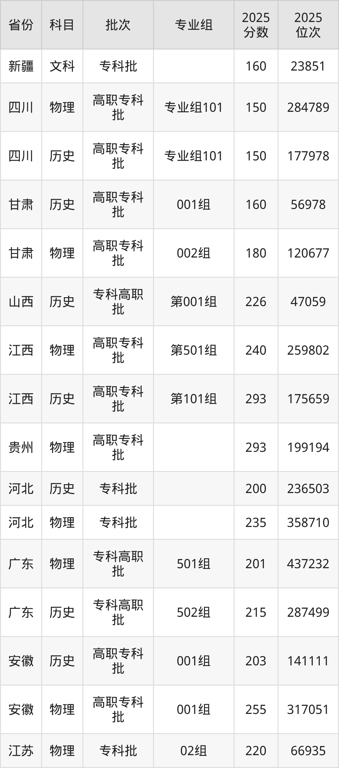2025年在专科物理类进行招生,各专业组分数线详情如下: