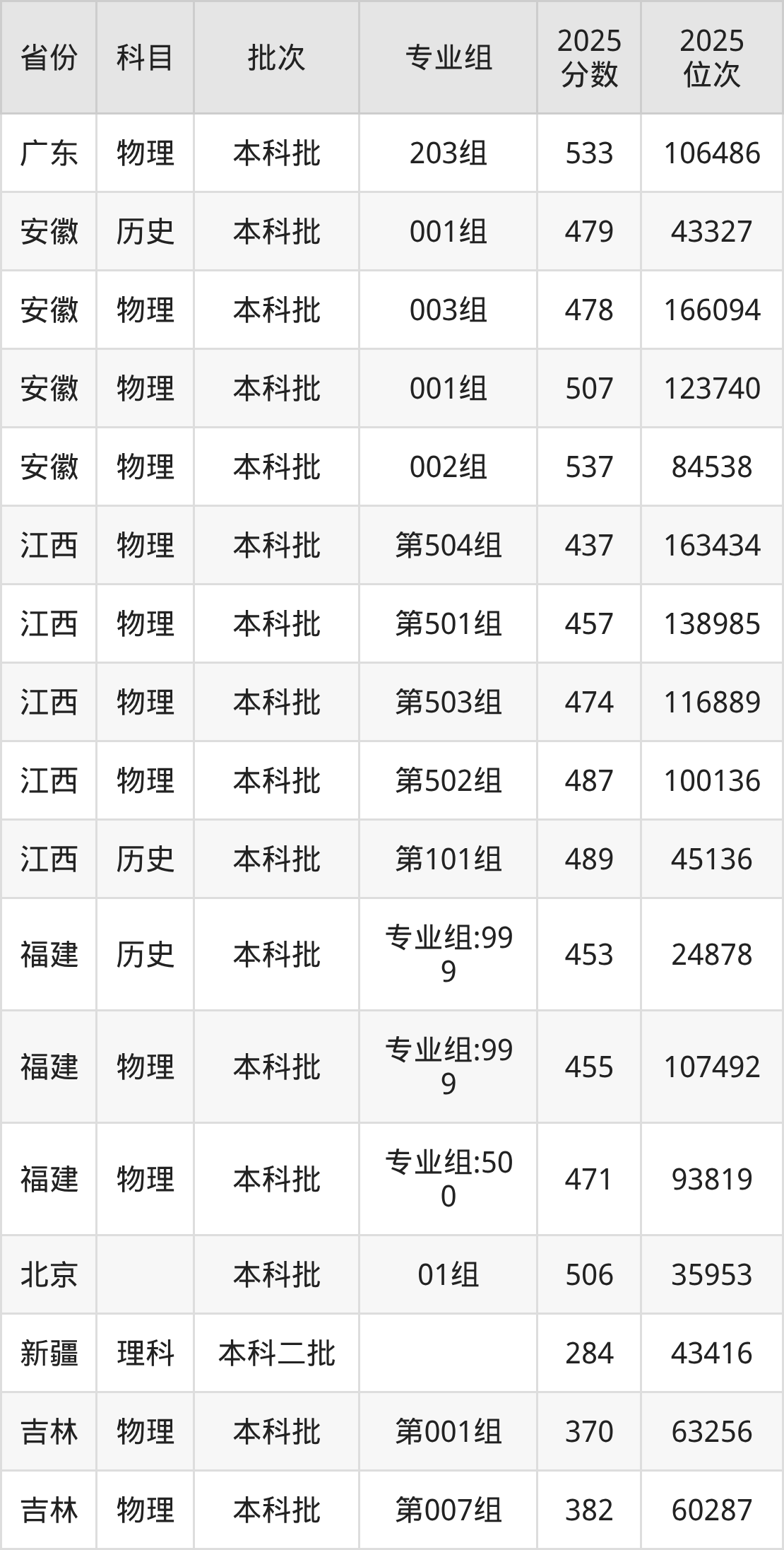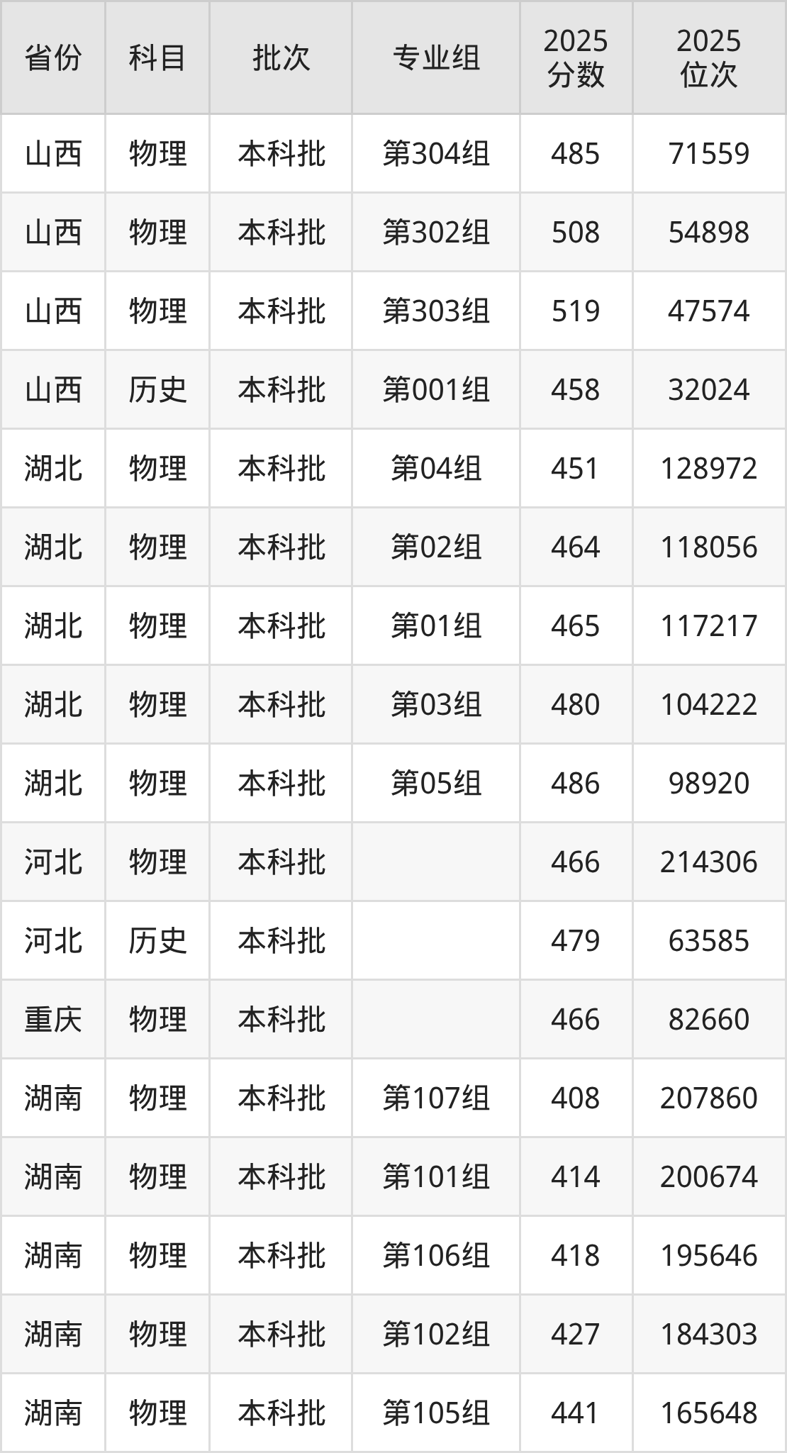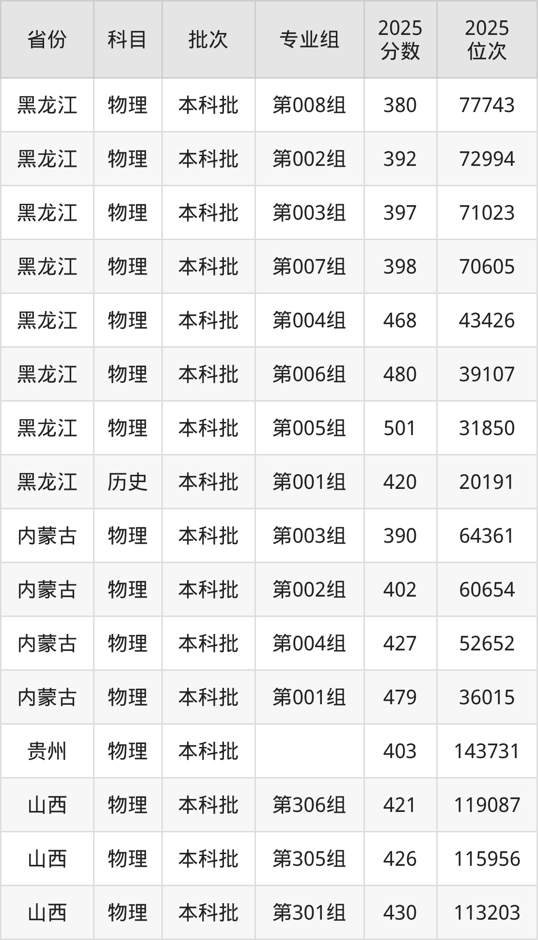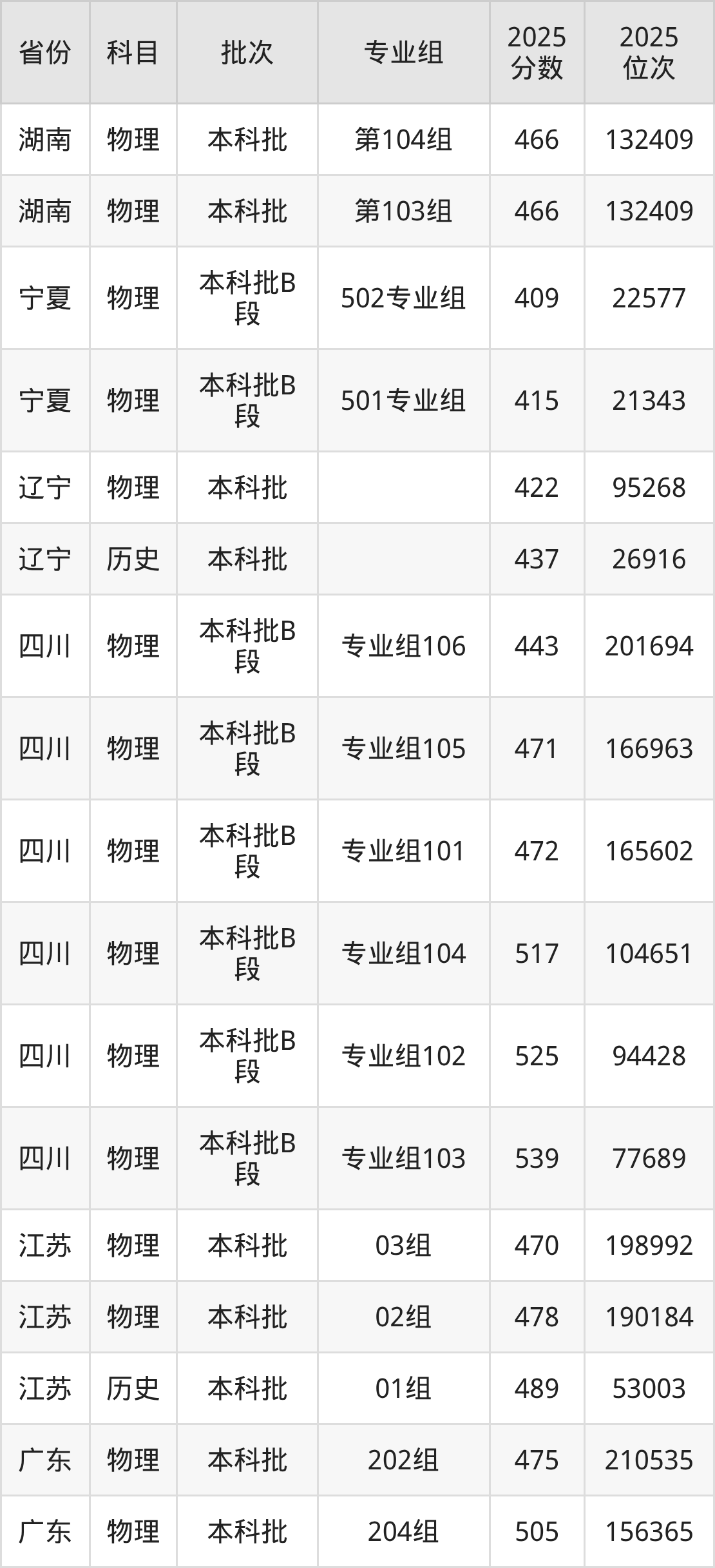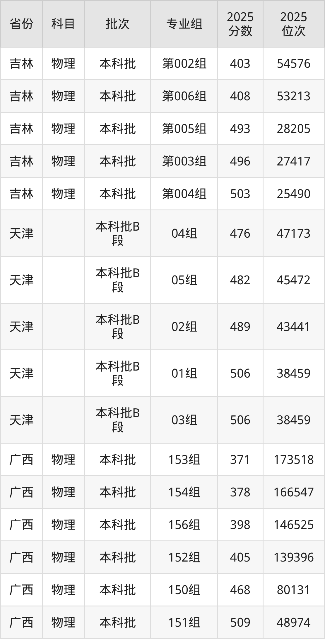 2025年在本科物理类进行招生,各专业组分数线详情如下: